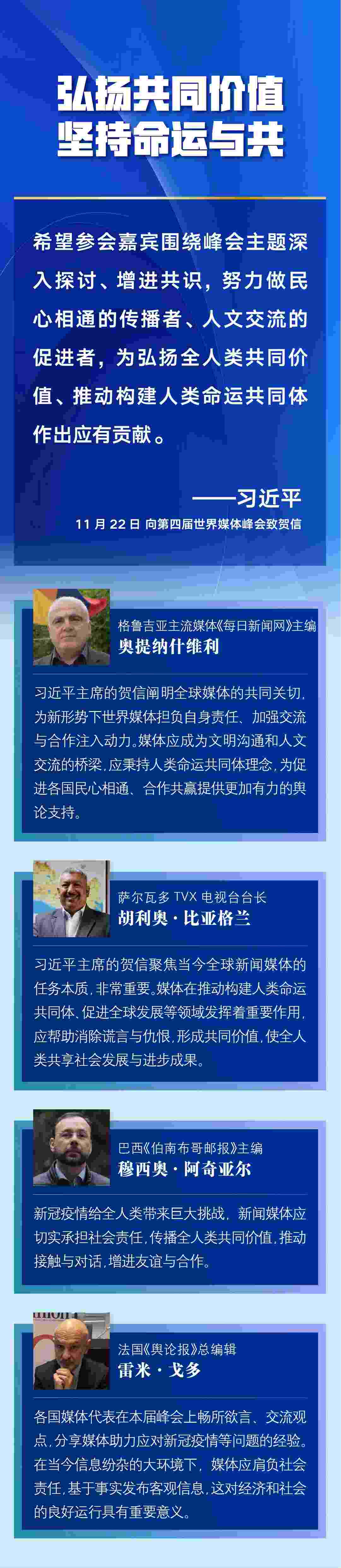 多國媒體人士認為,習(xí)近平主席的賀信對全球媒體更好肩負社會責(zé)任、廣泛凝聚世界共識作出重要闡述,為新形勢下世界媒體加強交流與合作、弘揚全人類共同價值、推動構(gòu)建人類命運共同體注入新的推動力——