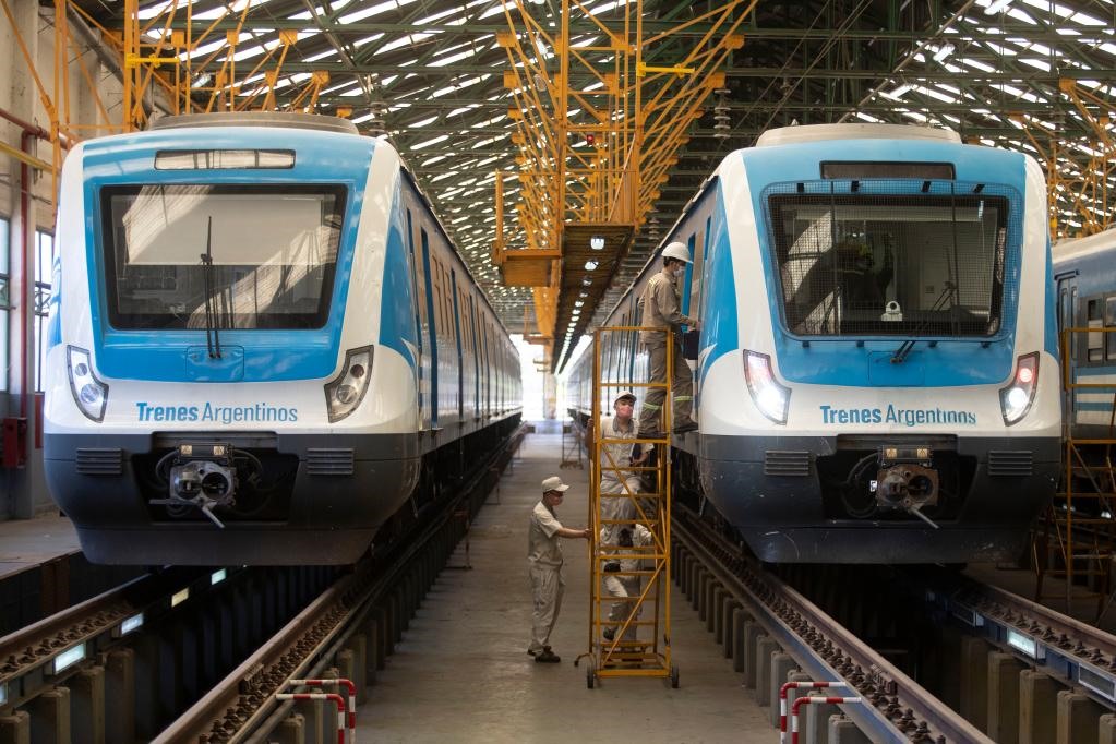 2020年11月16日,在布宜諾斯艾利斯省拉瓦約,中國和阿根廷技術人員對阿根廷城際鐵路列車進行日常檢查。