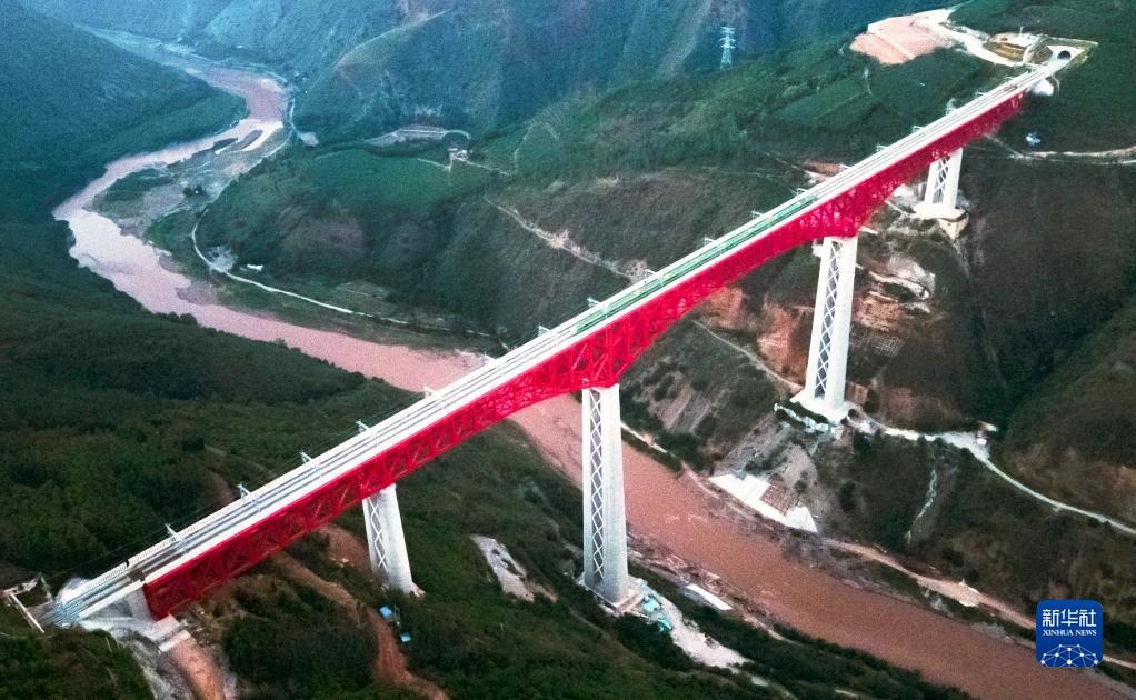 中老鐵路首發(fā)列車駛過(guò)中國(guó)云南省元江哈尼族彝族傣族自治縣境內(nèi)的元江雙線特大橋(12月3日攝,無(wú)人機(jī)照片)。新華社記者王冠森攝