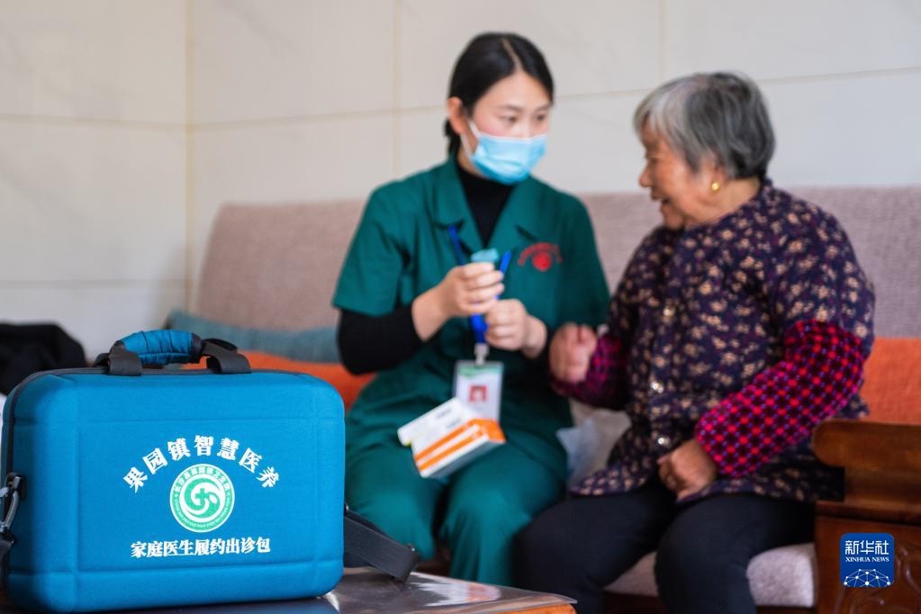11月12日,在湖南省長(zhǎng)沙市長(zhǎng)沙縣果園鎮(zhèn)楊泗廟社區(qū),醫(yī)務(wù)人員劉敏指導(dǎo)居家老人用藥。新華社記者陳思汗攝