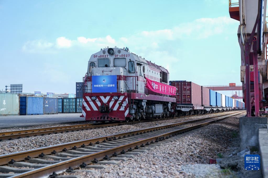 2021年10月29日,首班“中歐班列—進(jìn)博號(hào)”列車抵達(dá)上海。當(dāng)日,首班“中歐班列—進(jìn)博號(hào)”到達(dá)上海,從德國漢堡出發(fā)的該趟班列上裝載了智能真空噴射沖洗系統(tǒng)、電機(jī)零件等第四屆中國國際進(jìn)口博覽會(huì)參展展品,這也是進(jìn)博會(huì)展品首次坐中歐班列直達(dá)上海。新華社記者 丁汀 攝