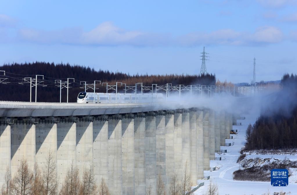 試運(yùn)行期間,高鐵列車行駛在沈佳高鐵白敦段上(2021年12月3日攝,無人機(jī)照片)。2021年12月24日,沈陽至佳木斯高鐵長白山至敦化段正式開通運(yùn)營,長白山風(fēng)景區(qū)接入全國高鐵網(wǎng),長春至長白山最快2小時(shí)18分可達(dá)。沈佳高鐵白敦段位于吉林省延邊朝鮮族自治州境內(nèi),設(shè)計(jì)時(shí)速250公里,由于其穿越原始森林,被譽(yù)為“森林高鐵”。新華社發(fā)(劉慎庫 攝)