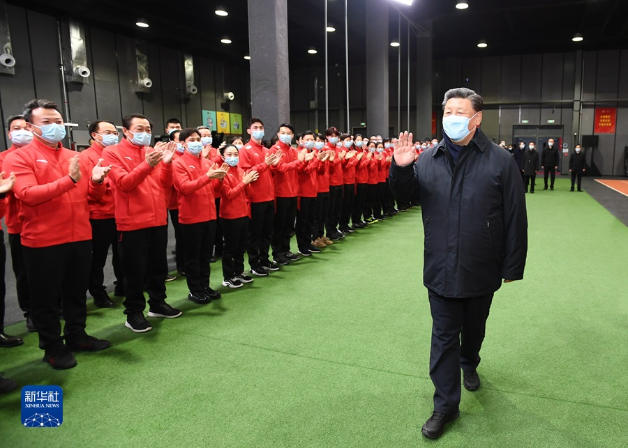 1月4日,中共中央總書記、國家主席、中央軍委主席習近平在北京考察2022年冬奧會、冬殘奧會籌辦備賽工作。這是4日下午,習近平在二七廠冰雪項目訓練基地專項體能訓練館,向運動員、教練員、服務保障人員揮手致意。新華社記者 謝環(huán)馳 攝