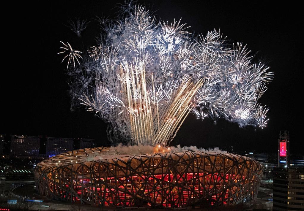 2月4日晚,第二十四屆冬季奧林匹克運(yùn)動(dòng)會(huì)開(kāi)幕式在北京國(guó)家體育場(chǎng)舉行。圖為焰火表演。新華社記者鄔惠我攝