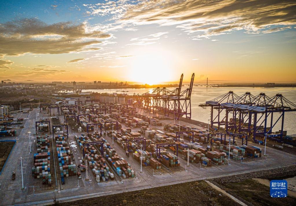 這是2021年5月26日在海南洋浦經(jīng)濟(jì)開(kāi)發(fā)區(qū)拍攝的洋浦國(guó)際集裝箱碼頭(無(wú)人機(jī)照片)。新華社記者 蒲曉旭 攝