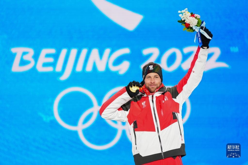 2月8日,單板滑雪男子平行大回轉比賽冠軍、奧地利選手本亞明·卡爾在獎牌頒發(fā)儀式上。新華社記者 朱崢 攝