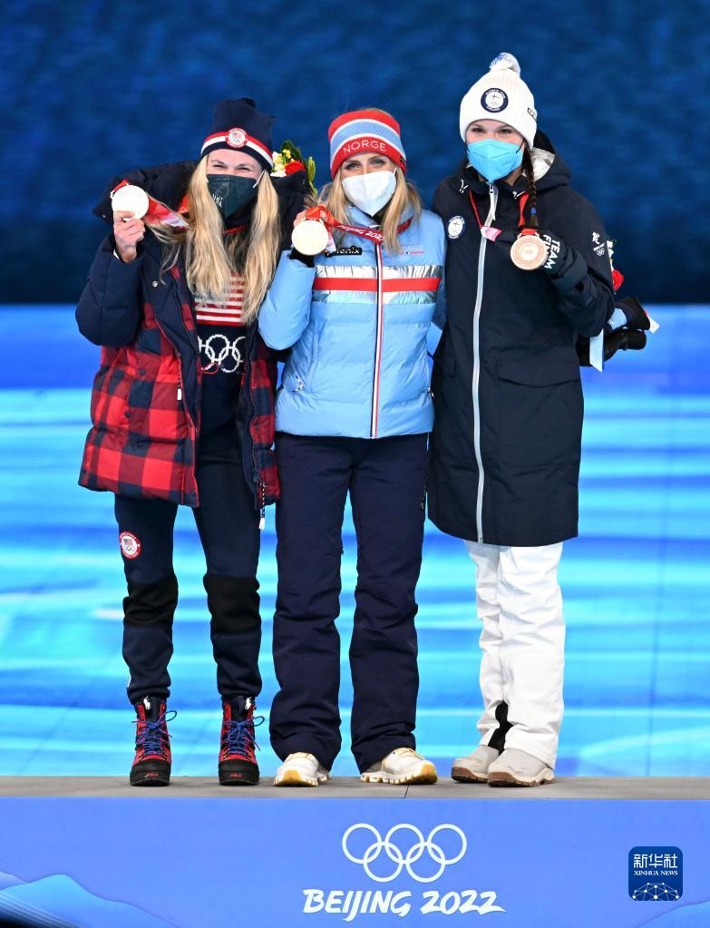 這是越野滑雪女子30公里集體出發(fā)(自由技術)冠軍挪威選手特蕾絲·約海于格(中)、亞軍美國選手杰茜·迪金斯(左)和季軍芬蘭選手凱爾圖·尼斯卡寧在獎牌頒發(fā)儀式上。