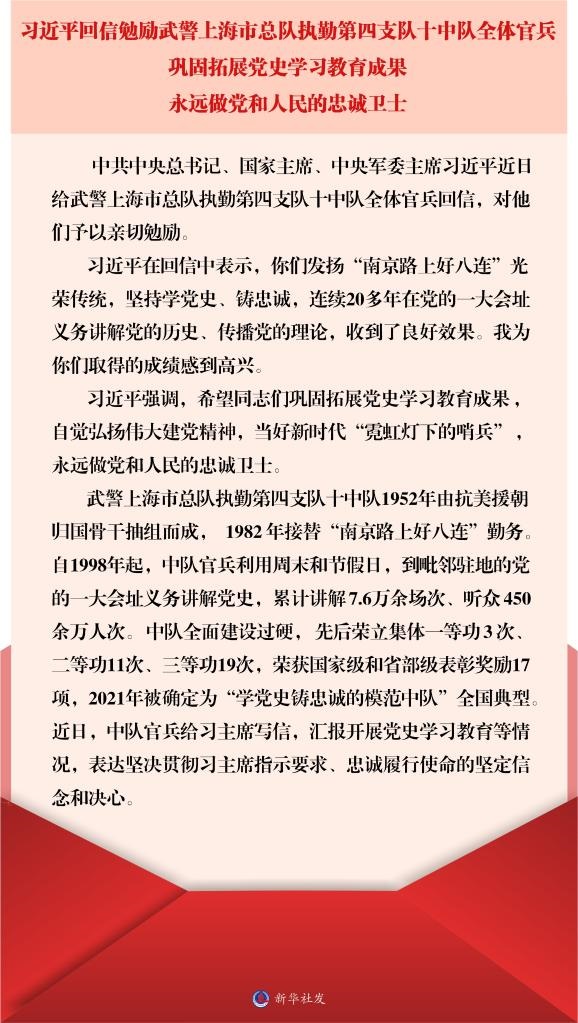 武警上海市總隊(duì)執(zhí)勤第四支隊(duì)十中隊(duì)1952年由抗美援朝歸國(guó)骨干抽組而成,1982年接替“南京路上好八連”勤務(wù)。自1998年起,中隊(duì)官兵利用周末和節(jié)假日,到毗鄰駐地的黨的一大會(huì)址義務(wù)講解黨史,累計(jì)講解7.6萬(wàn)余場(chǎng)次、聽(tīng)眾450余萬(wàn)人次。中隊(duì)全面建設(shè)過(guò)硬,先后榮立集體一等功3次、二等功11次、三等功19次,榮獲國(guó)家級(jí)和省部級(jí)表彰獎(jiǎng)勵(lì)17項(xiàng),2021年被確定為“學(xué)黨史鑄忠誠(chéng)的模范中隊(duì)”全國(guó)典型。近日,中隊(duì)官兵給習(xí)主席寫(xiě)信,匯報(bào)開(kāi)展黨史學(xué)習(xí)教育等情況,表達(dá)堅(jiān)決貫徹習(xí)主席指示要求、忠誠(chéng)履行使命的堅(jiān)定信念和決心。