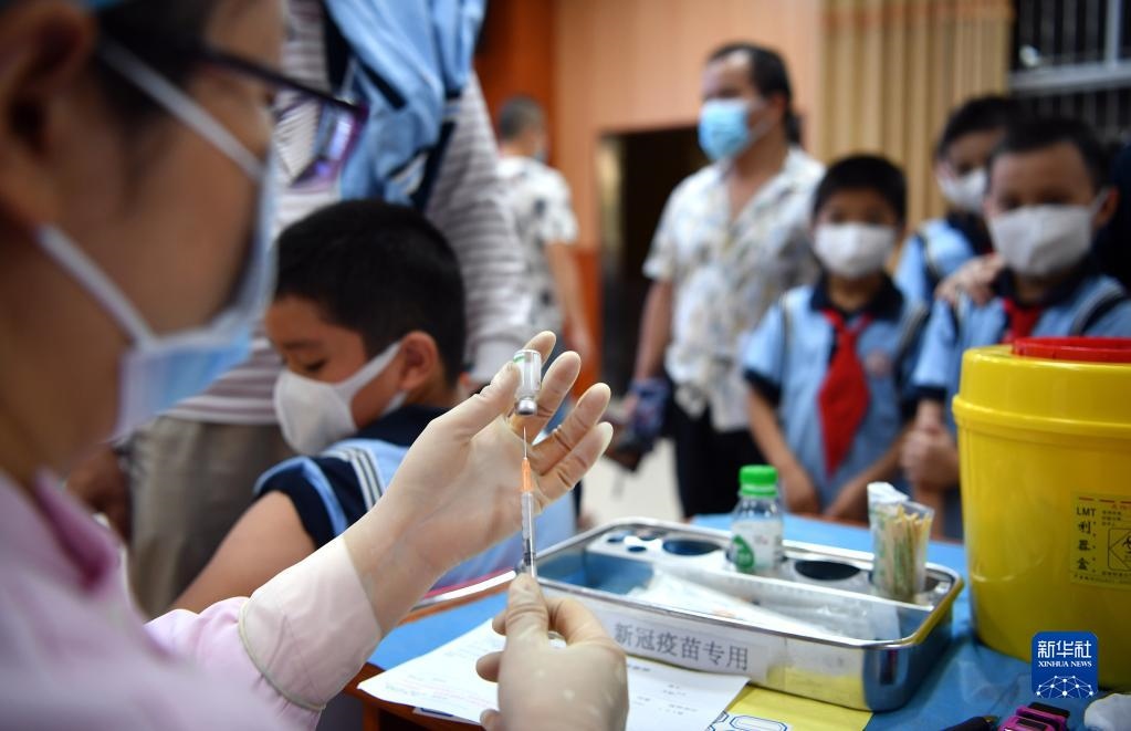 醫(yī)護(hù)人員在??谑协偵降谌W(xué)為學(xué)生接種疫苗(2021年10月28日攝)。新華社記者 郭程 攝