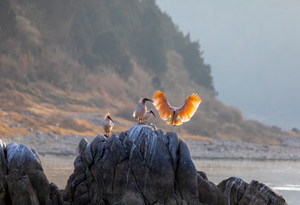 2021年1月28日,朱鹮在陜西省洋縣黃金峽鎮(zhèn)龐灣村漢江段的河石上棲息 陶本耀攝 / 本刊