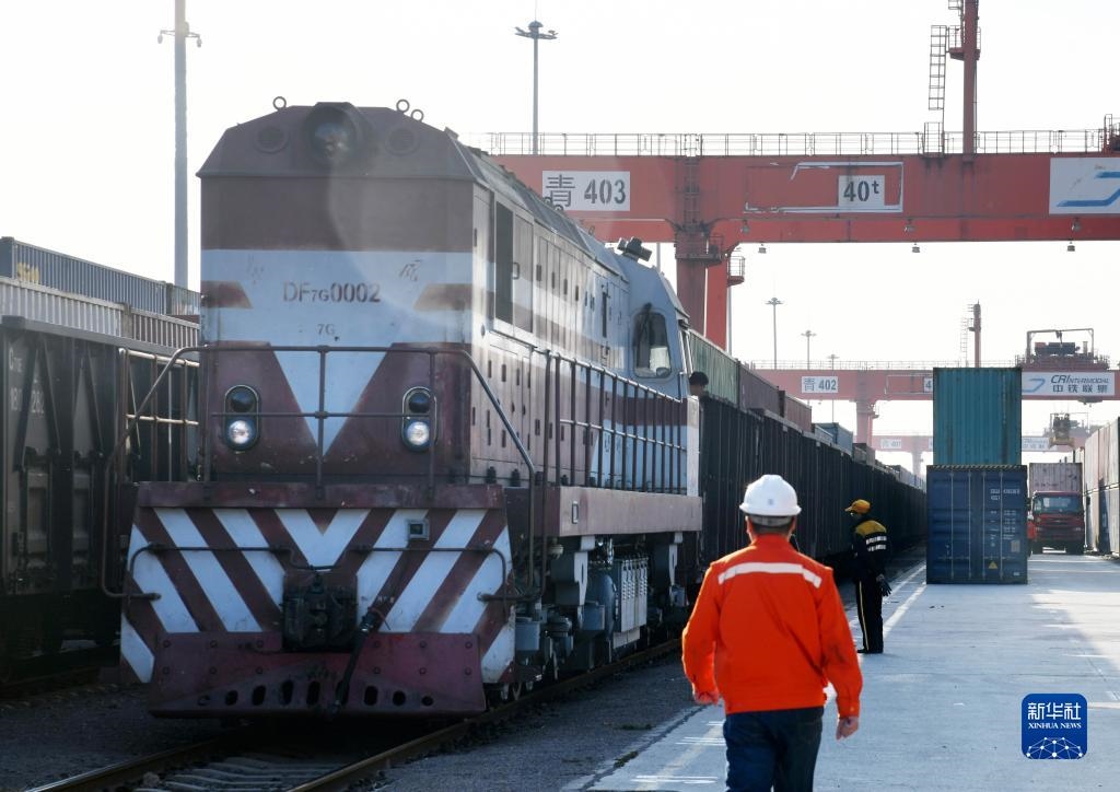 一列搭載輪胎、汽車配件、電子元件等貨物的“齊魯號”中亞班列即將發(fā)車駛出位于青島的中國-上合組織地方經(jīng)貿(mào)合作示范區(qū)青島多式聯(lián)運(yùn)中心(2020年11月9日攝)。新華社記者 李紫恒 攝
