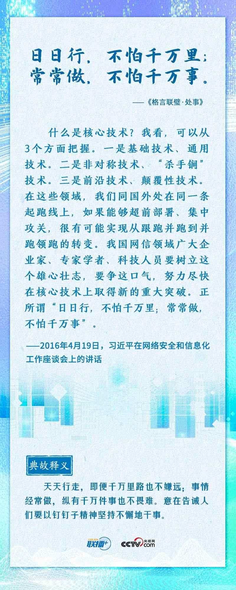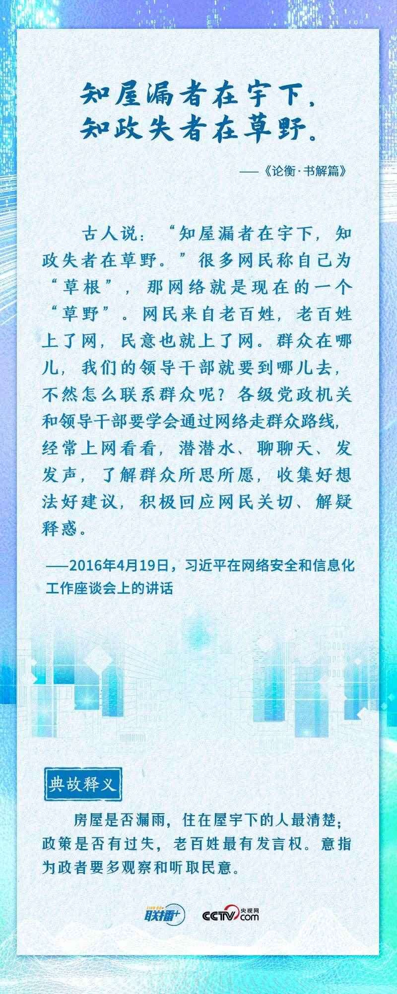 “知屋漏者在宇下,知政失者在草野”“日日行,不怕千萬里;常常做,不怕千萬事”......2016年4月19日,習(xí)近平總書記在網(wǎng)絡(luò)安全和信息化工作座談會上,從六個方面深刻回答了事關(guān)我國網(wǎng)信事業(yè)發(fā)展的一系列重大理論和實(shí)踐問題,并多次引經(jīng)據(jù)典加以闡述。