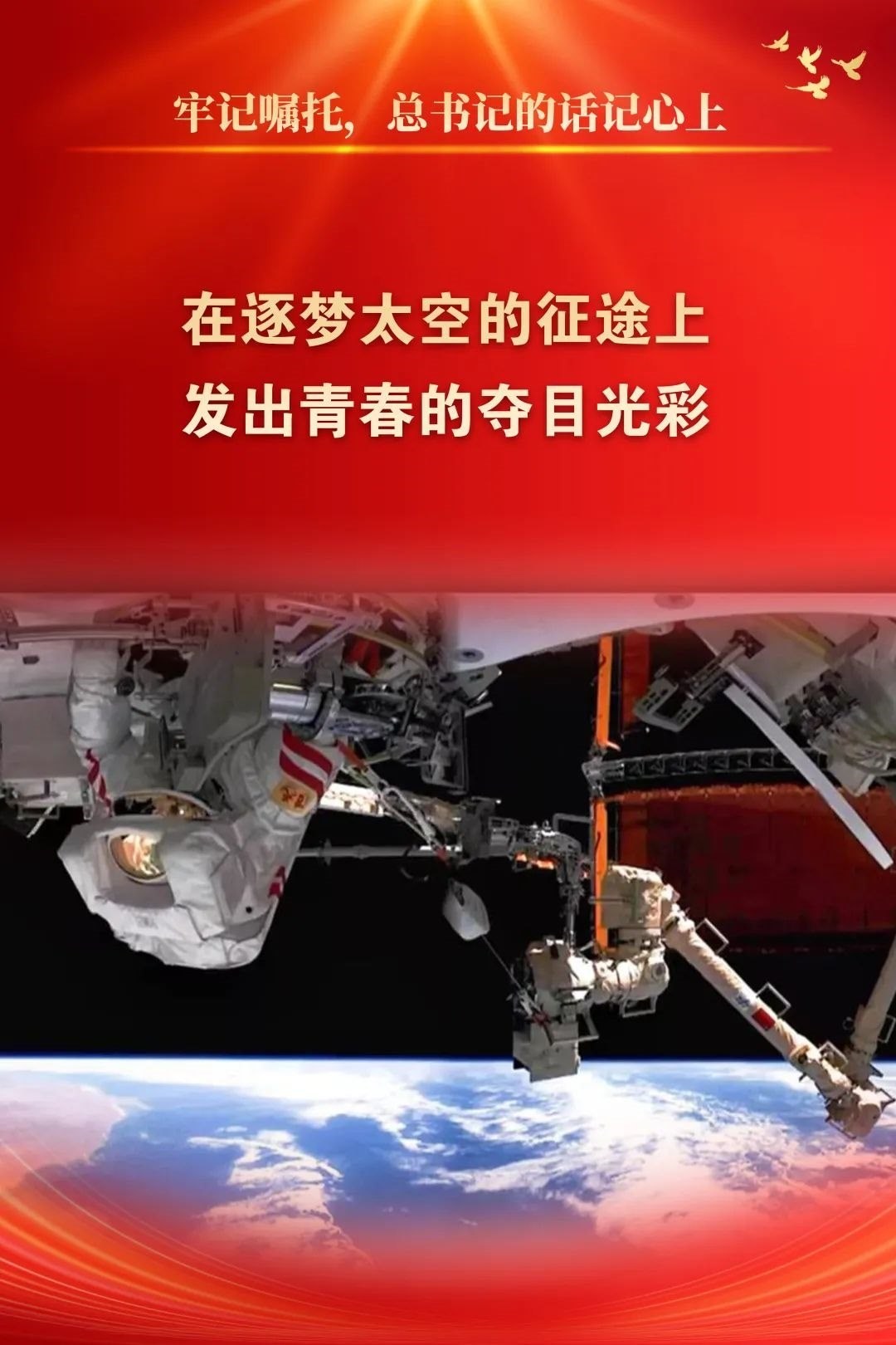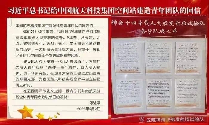 2022年5月2日,習(xí)近平總書(shū)記給中國(guó)航天科技集團(tuán)空間站建造青年團(tuán)隊(duì)回信,高度肯定航天青年,殷切期待青春奮斗。他強(qiáng)調(diào):“希望廣大航天青年弘揚(yáng)‘兩彈一星’精神、載人航天精神,勇于創(chuàng)新突破,在逐夢(mèng)太空的征途上發(fā)出青春的奪目光彩,為我國(guó)航天科技實(shí)現(xiàn)高水平自立自強(qiáng)再立新功?!币荒陙?lái),五院人持續(xù)學(xué)習(xí)重溫、堅(jiān)決貫徹落實(shí)習(xí)近平總書(shū)記重要回信精神和關(guān)于航天強(qiáng)國(guó)建設(shè)的重要指示批示精神,始終做到牢記囑托、感恩奮進(jìn),交出非凡“答卷”。