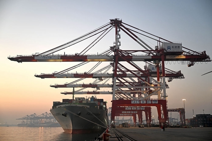 一艘貨輪靠泊在天津港聯(lián)盟國際集裝箱碼頭進行裝卸作業(yè)(2023年1月1日攝)。新華社記者 趙子碩 攝