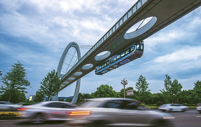 列車懸掛在軌道下方,從人們頭頂飛馳而過,這樣的科幻場(chǎng)景,最近在武漢東湖新技術(shù)開發(fā)區(qū)成了現(xiàn)實(shí)。圖為2023年5月9日,武漢“光谷光子號(hào)”空軌列車在綜合聯(lián)調(diào)和試運(yùn)行中。 新華社記者 肖藝九/攝