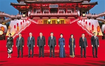 習(xí)近平夫婦為貴賓舉行唐朝傳統(tǒng)迎賓儀式。紫云樓前,禮樂(lè)和鳴,明快有力的古代佾舞、絢麗婀娜的芙蓉花舞,表達(dá)了古都西安人民的熱情好客,體現(xiàn)了中華文化兼容并蓄的精神風(fēng)貌。