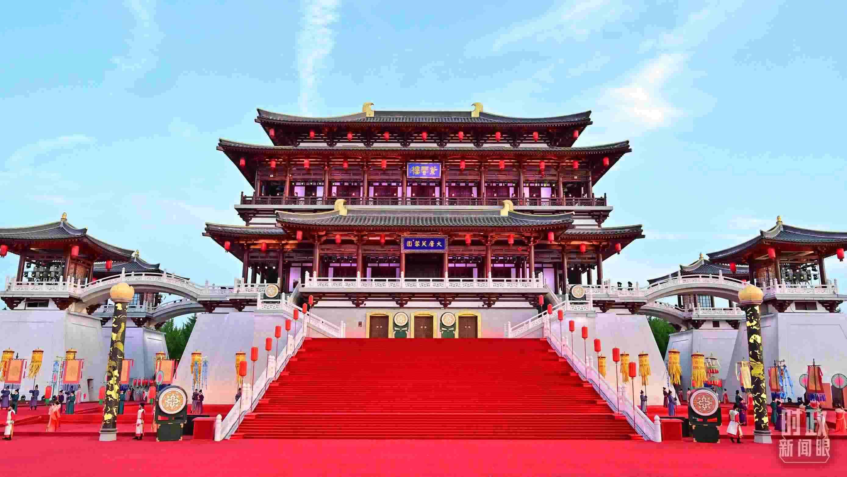 △紫云樓是大唐芙蓉園最主要的仿唐建筑群之一。18日晚的迎賓表演就是以紫云樓為背景。(總臺央視記者劉琦拍攝)