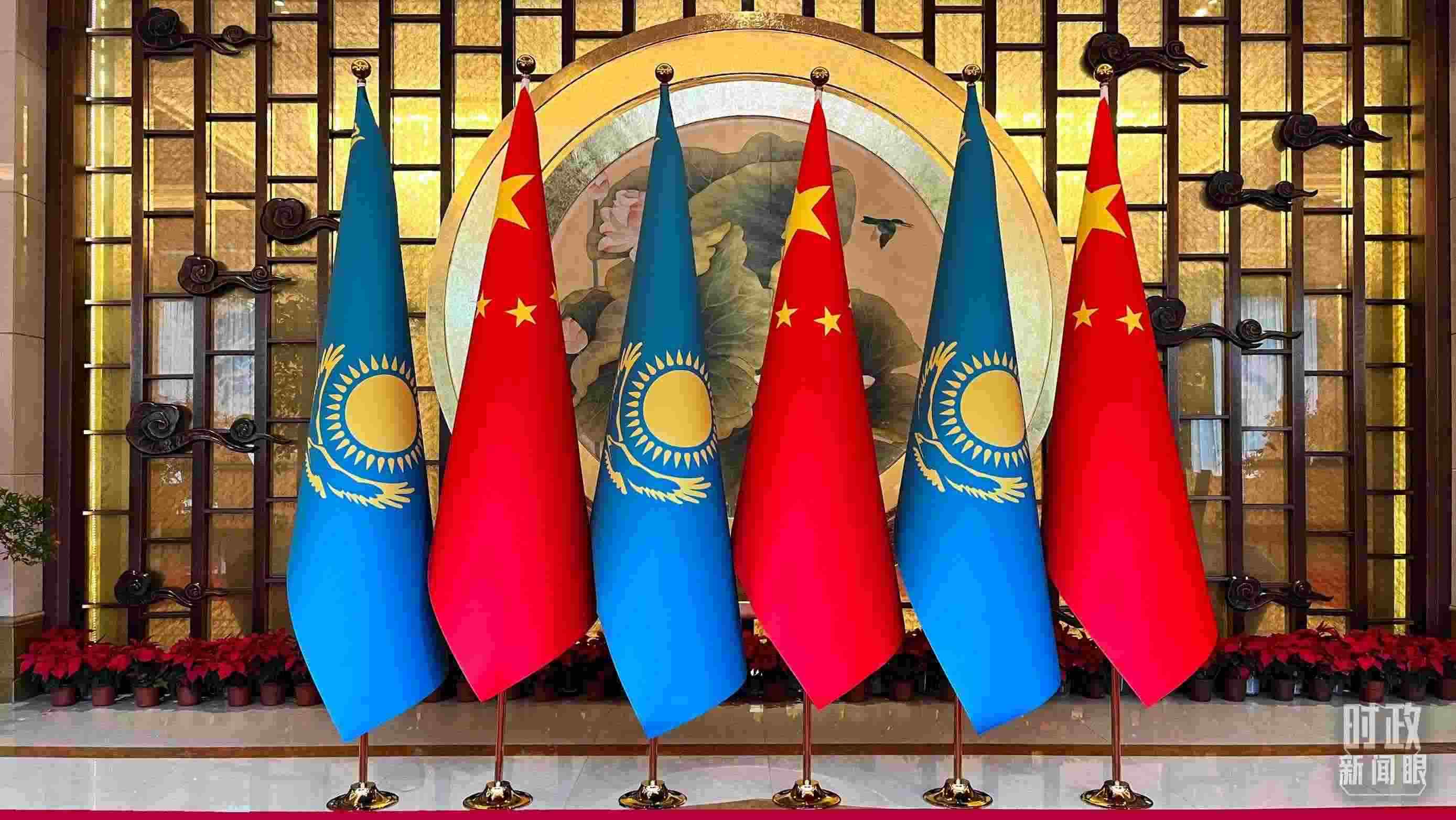 △中哈兩國元首會談現(xiàn)場外布置的兩國國旗。(總臺央視記者陸泓宇拍攝)