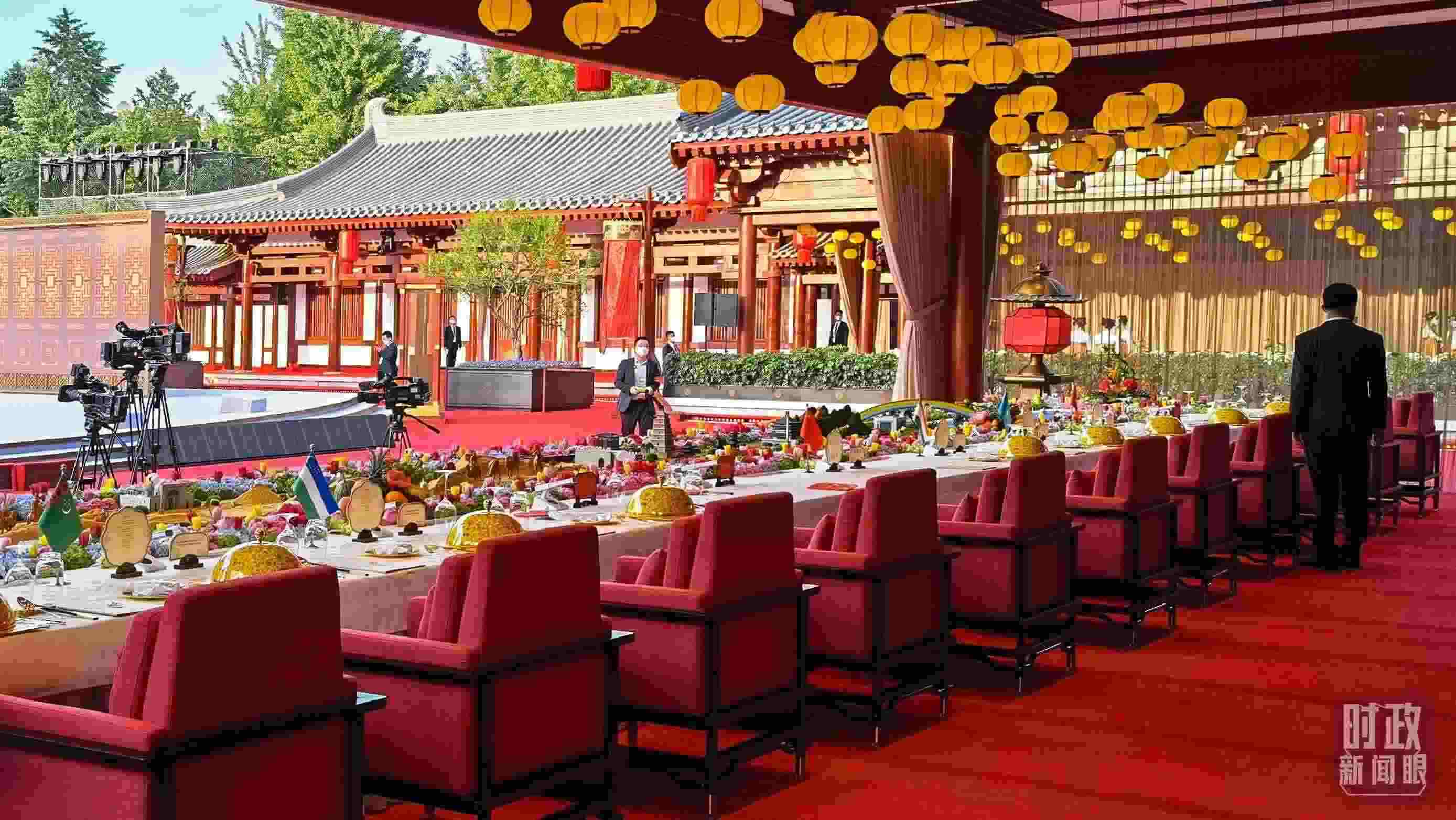 △歡迎晚宴的餐臺設計融入古絲綢之路和“一帶一路”元素,并穿插中國和中亞五國的標志性建筑,獨具匠心。(總臺央視記者石丞拍攝)