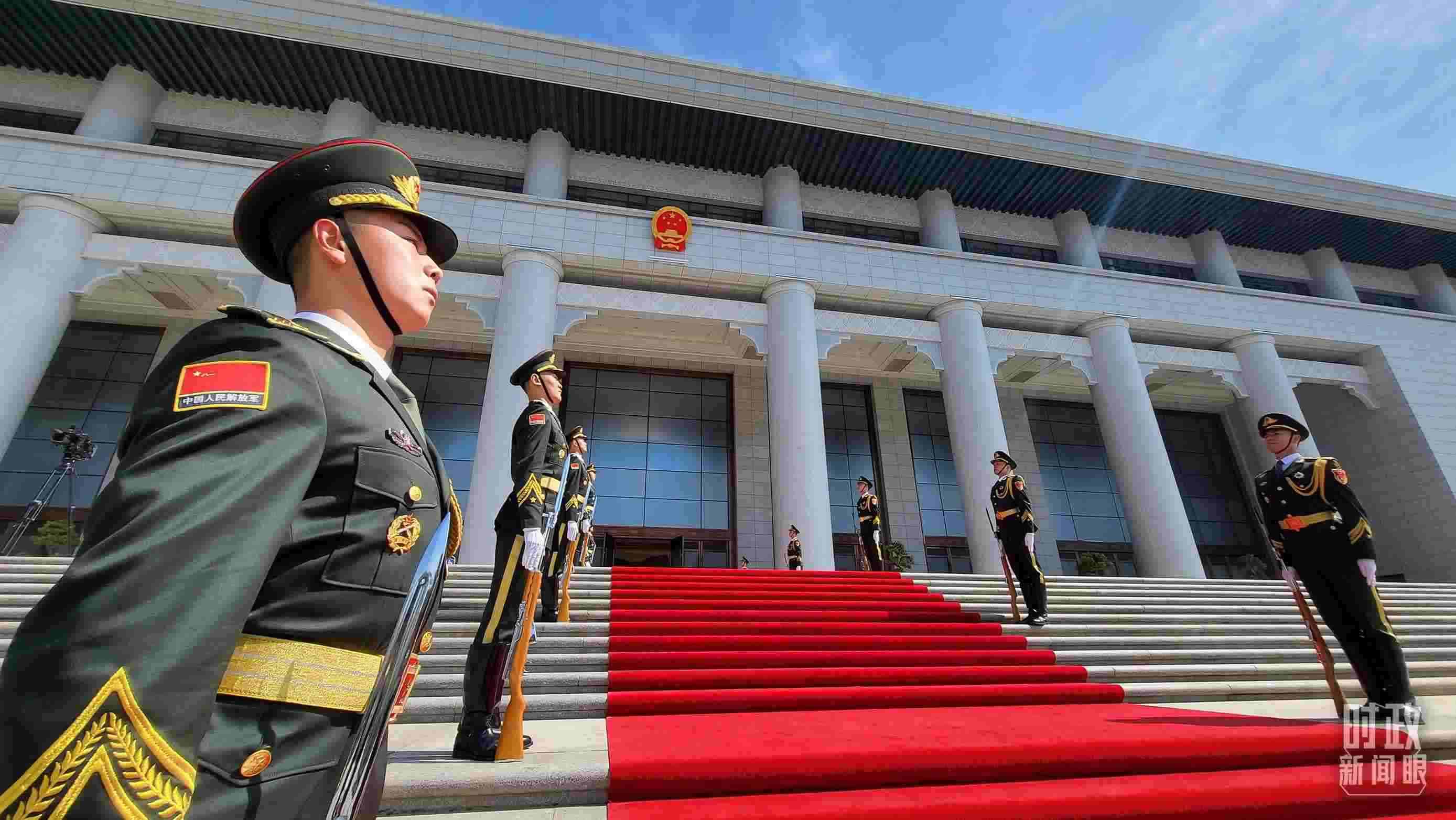 △陜西賓館會議中心外,禮兵列隊迎接貴賓。(總臺央視記者鐘信偉拍攝)