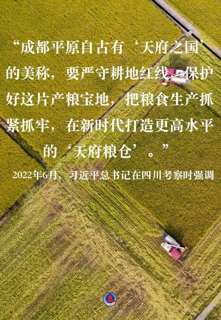 2022年6月,習(xí)近平總書記在四川考察時(shí)強(qiáng)調(diào),“成都平原自古有‘天府之國(guó)’的美稱,要嚴(yán)守耕地紅線,保護(hù)好這片產(chǎn)糧寶地,把糧食生產(chǎn)抓緊抓牢,在新時(shí)代打造更高水平的‘天府糧倉(cāng)’”。