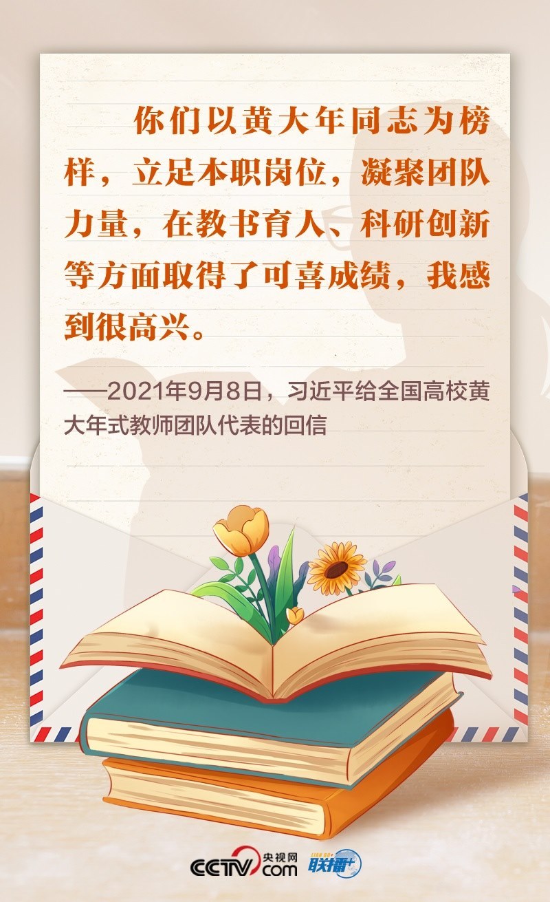2021年,首批黃大年式教師團(tuán)隊(duì)的代表給總書記寫信,匯報(bào)教學(xué)、科研等工作情況,表達(dá)了堅(jiān)守教育報(bào)國(guó)理想、為民族復(fù)興貢獻(xiàn)力量的決心??倳浕匦趴隙舜蠹业墓ぷ鞒尚?,勉勵(lì)大家繼續(xù)學(xué)習(xí)弘揚(yáng)黃大年同志等優(yōu)秀教師的高尚精神,立德修身,潛心治學(xué),開(kāi)拓創(chuàng)新,真正把為學(xué)、為事、為人統(tǒng)一起來(lái),當(dāng)好學(xué)生成長(zhǎng)的引路人。