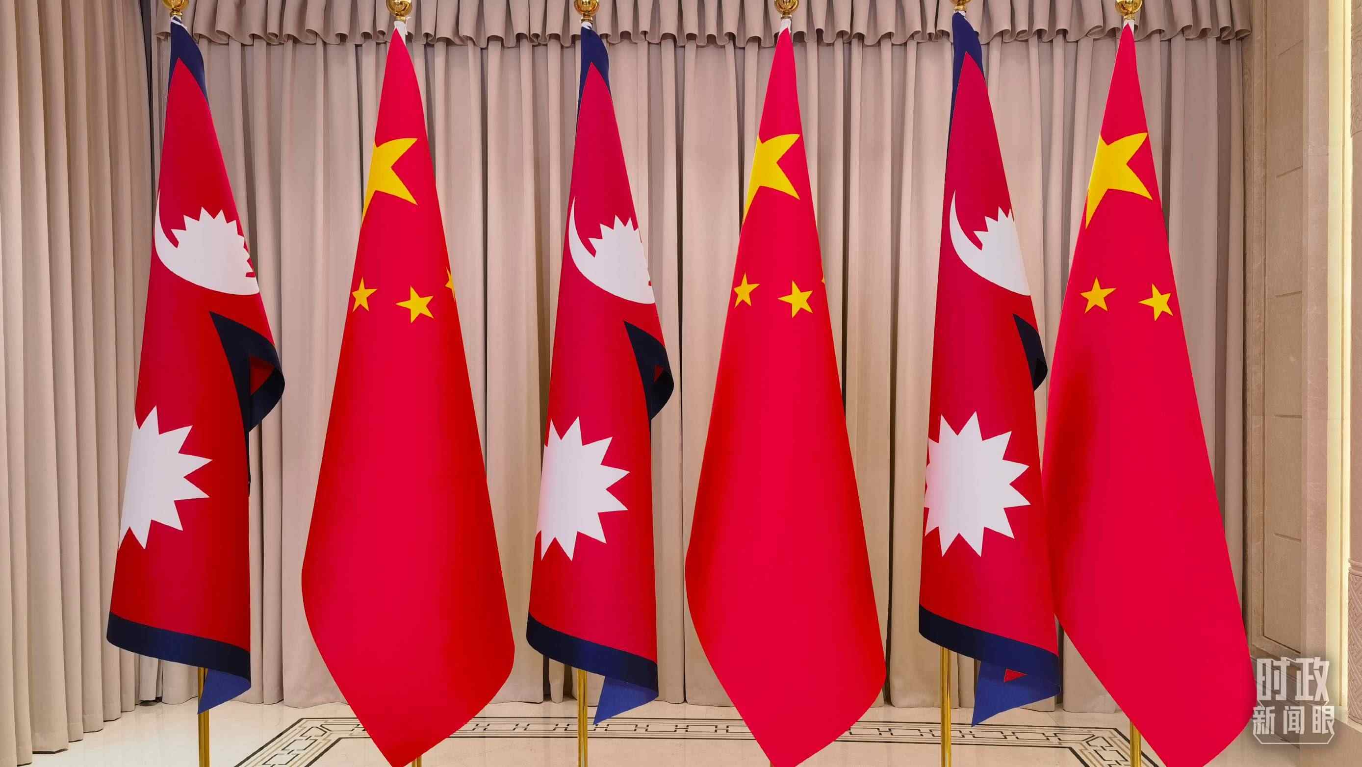 △會(huì)見現(xiàn)場擺放的中國、尼泊爾國旗。(總臺央視記者周志國拍攝)