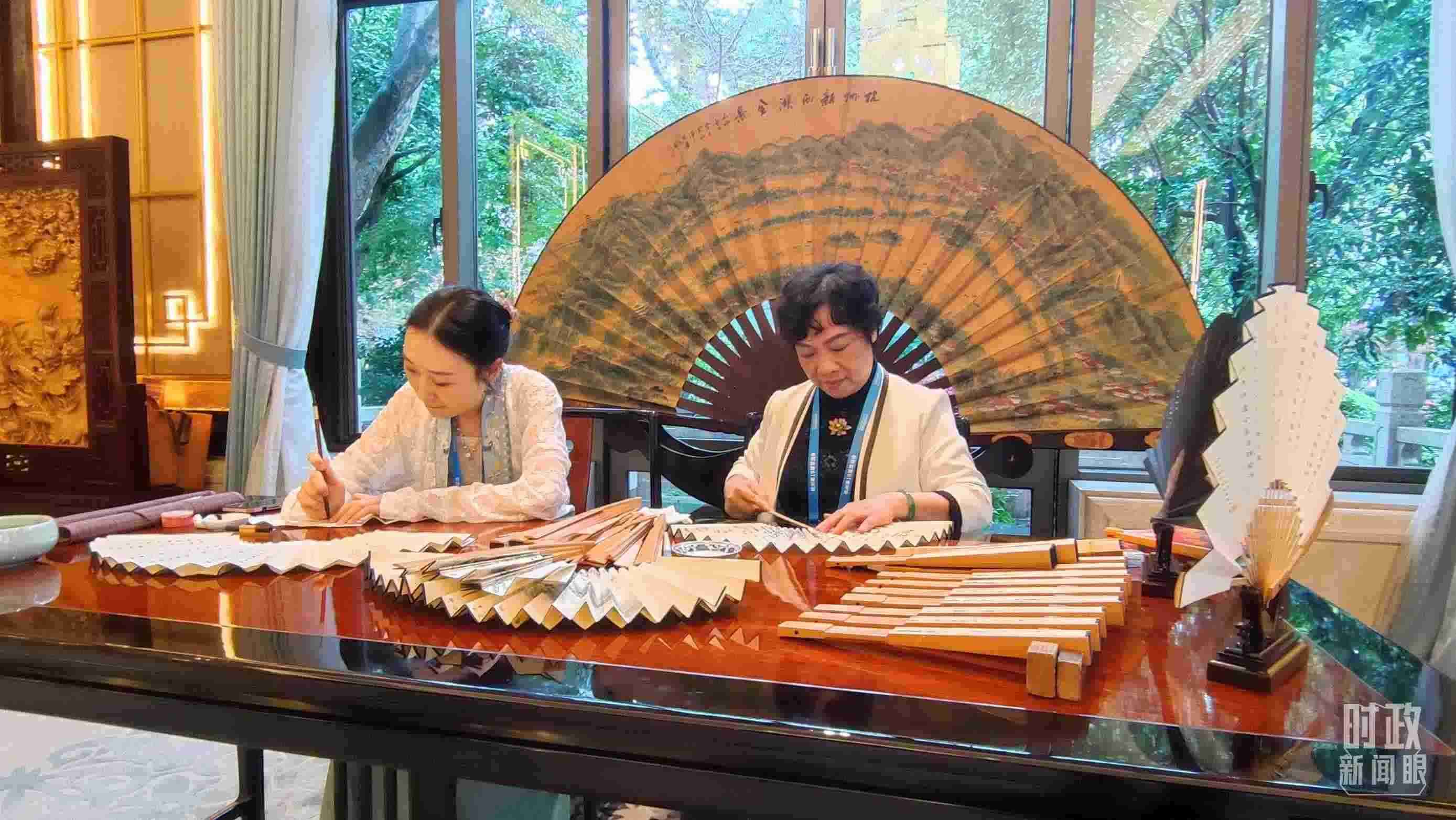 宴會(huì)廳外,東陽木雕、杭州刺繡、王星記扇等浙江非物質(zhì)文化遺產(chǎn)展示,吸引貴賓們流連駐足。