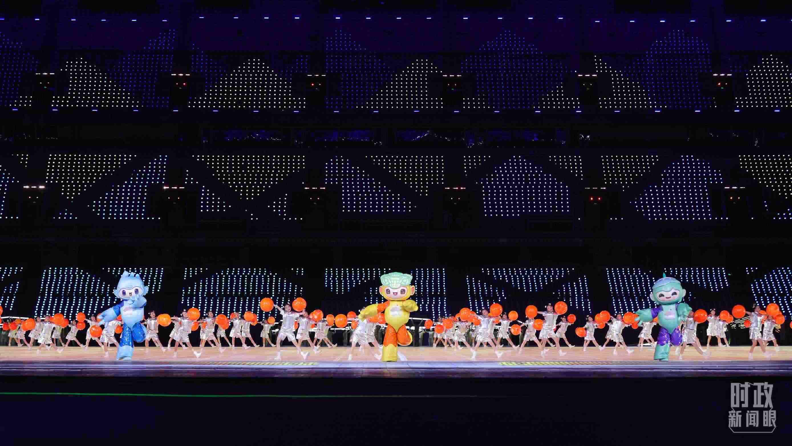 △開幕式文藝表演中的亞運(yùn)會(huì)吉祥物。(總臺央視記者魏幫軍拍攝)
