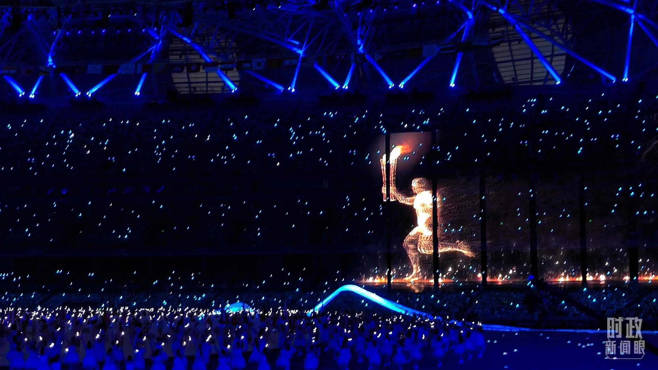 △“數(shù)字火炬手”入場,與現(xiàn)場火炬手共同點(diǎn)燃主火炬。(總臺央視記者王子杭、總臺國廣記者李晉拍攝)