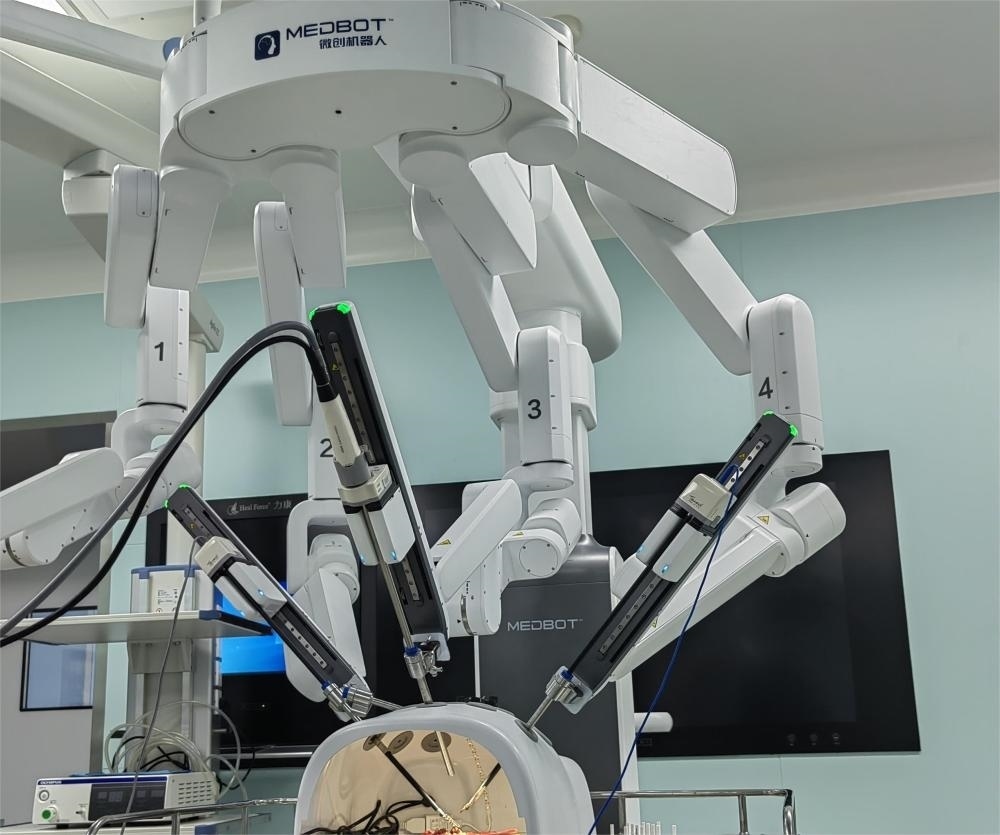 這是實施5G+AI超遠程微創(chuàng)手術(shù)的四臂腔鏡機器人。(受訪者供圖)