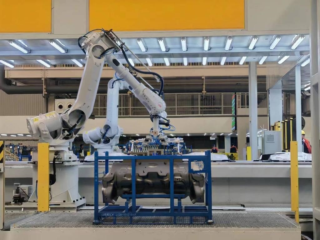吉利汽車西安工廠沖壓車間機(jī)器人正在自動抓件。新華社記者姜辰蓉 攝