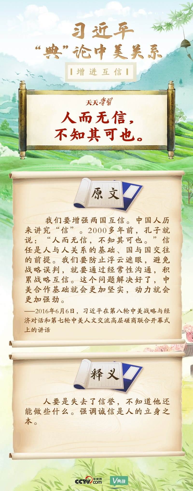 黨的十八大以來,習(xí)近平主席就中美關(guān)系發(fā)表了一系列重要講話。他站在時代高度分析、研判中美關(guān)系現(xiàn)狀及發(fā)展趨勢,并引經(jīng)據(jù)典為發(fā)展中美關(guān)系指出正確方向。這些論述蘊含深刻的戰(zhàn)略思維和政治智慧,具有重大現(xiàn)實意義和深遠歷史意義。央視網(wǎng)《天天學(xué)習(xí)》與您一起深刻領(lǐng)會。