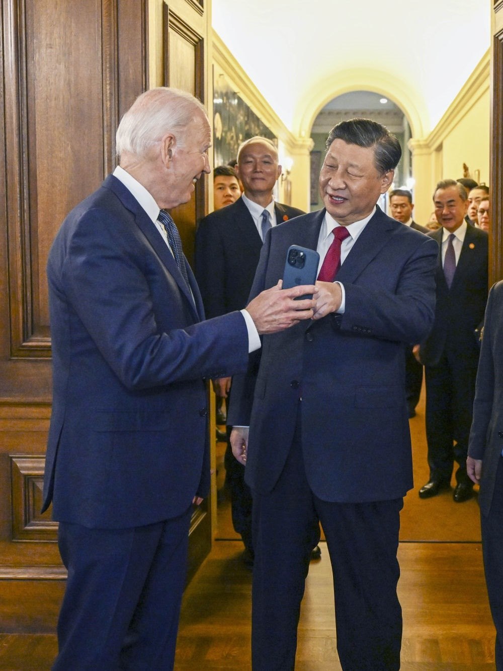 當(dāng)?shù)貢r間11月15日中午,美國舊金山郊外的斐洛里莊園,習(xí)近平主席結(jié)束同美國總統(tǒng)拜登的晤談,出席拜登總統(tǒng)舉行的宴會。這是拜登在手機(jī)上展示1985年習(xí)近平在擔(dān)任正定縣委書記時訪問舊金山的一張照片。新華社記者 李學(xué)仁 攝