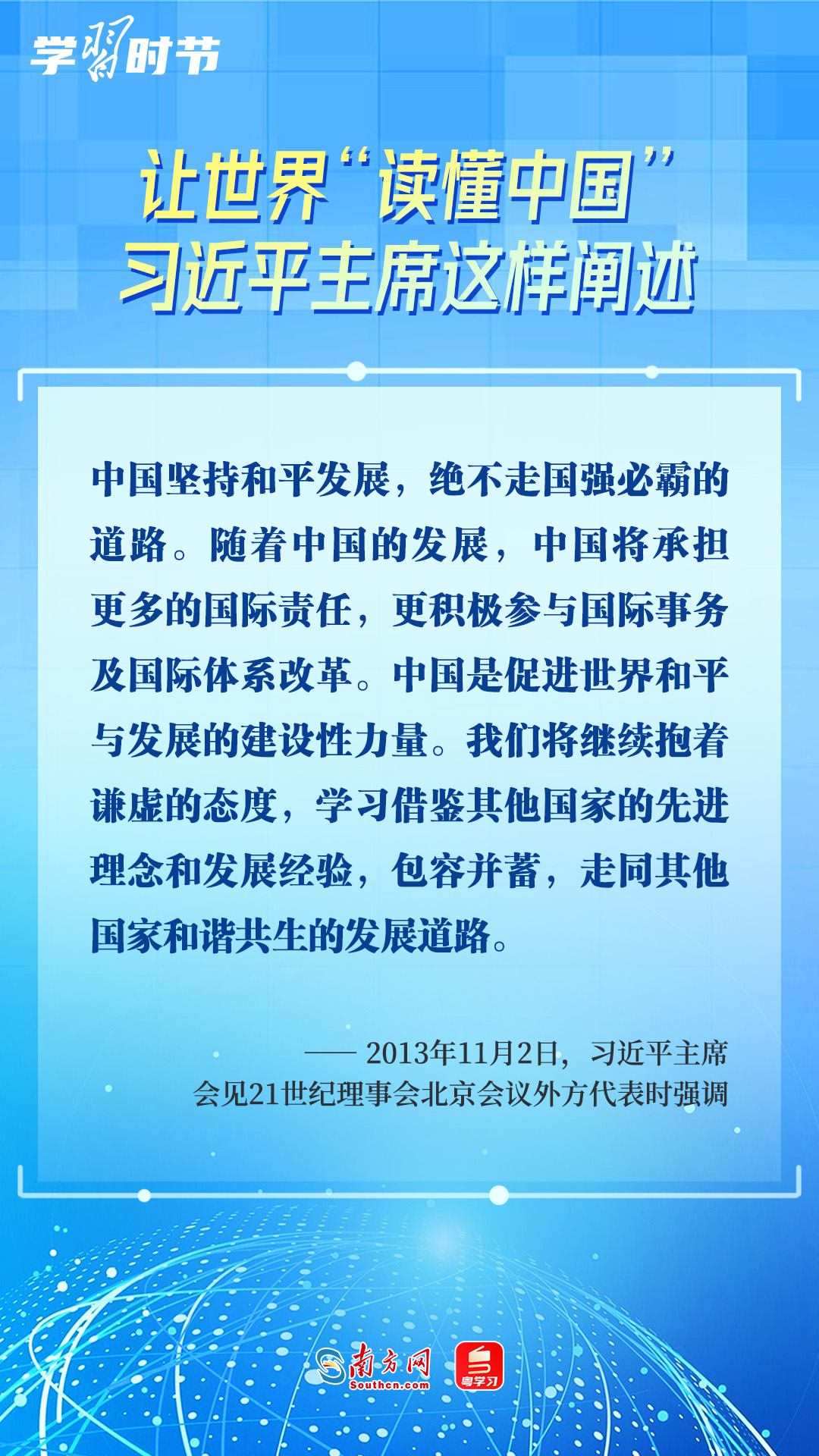 習(xí)近平主席高度重視“讀懂中國(guó)”國(guó)際會(huì)議,多次會(huì)見(jiàn)與會(huì)代表、向會(huì)議致辭或致賀信,闡述中國(guó)的發(fā)展道路、改革開(kāi)放、對(duì)外政策等,讓我們一同學(xué)習(xí)。