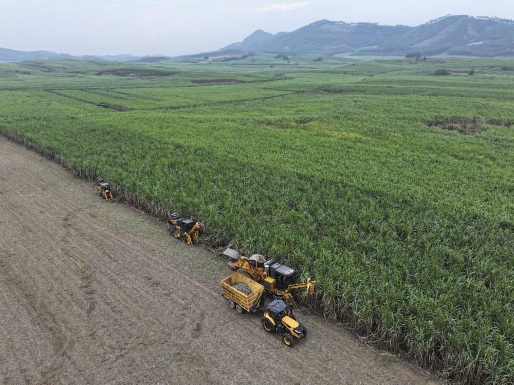 2023年12月12日,在廣西來(lái)賓市興賓區(qū)小平陽(yáng)鎮(zhèn),農(nóng)民在收割甘蔗(無(wú)人機(jī)照片)。新華社記者 周華 攝