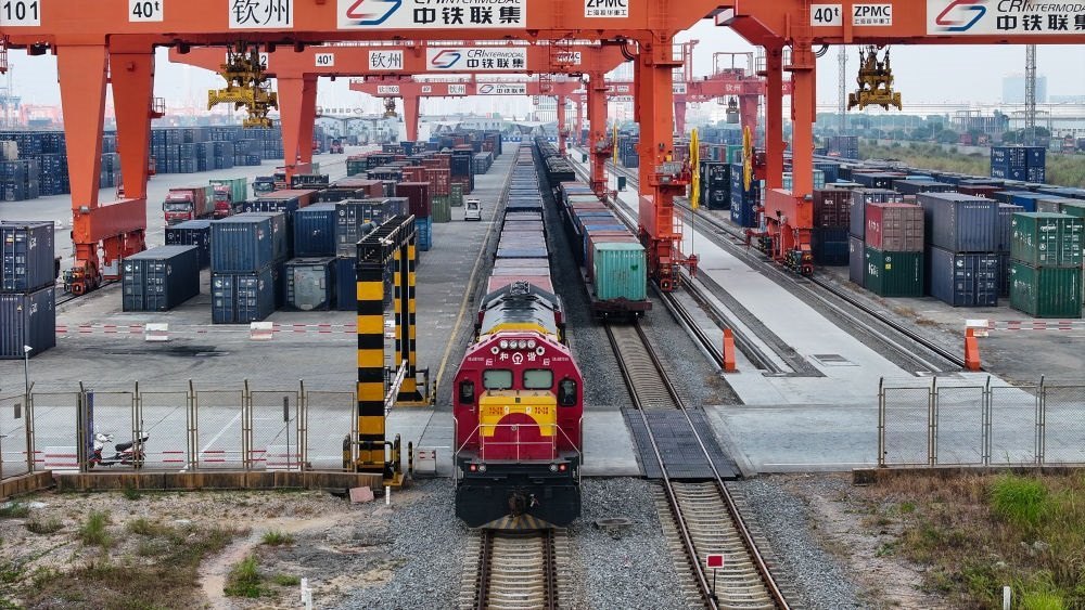 在欽州集裝箱中心站,鐵海聯(lián)運(yùn)班列整裝待發(fā)(11月24日攝,無(wú)人機(jī)照片)。新華社記者 張愛(ài)林 攝