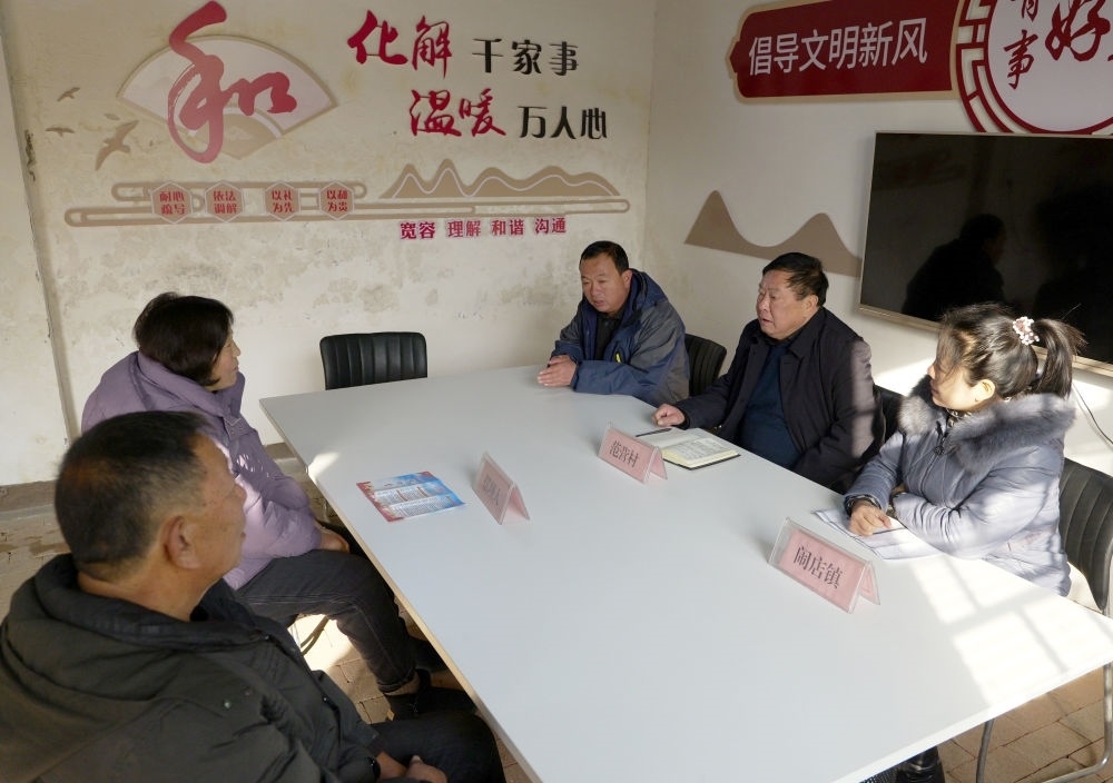 在寶豐縣鬧店鎮(zhèn)范營村“擺理堂”,村鎮(zhèn)干部(右)為村民進行信訪調(diào)解(2023年12月20日攝)。河南省寶豐縣積極推進四下基層工作深入開展,已打造鬧店鎮(zhèn)范營村“擺理堂”、石橋鎮(zhèn)東大莊村“老娘舅茶室”等系列鄉(xiāng)村社區(qū)服務陣地,協(xié)調(diào)鄰里關系,有效化解各類矛盾,同時不斷豐富工作內(nèi)容,拓展服務功能,助力鄉(xiāng)村振興。新華社記者 李嘉南 攝