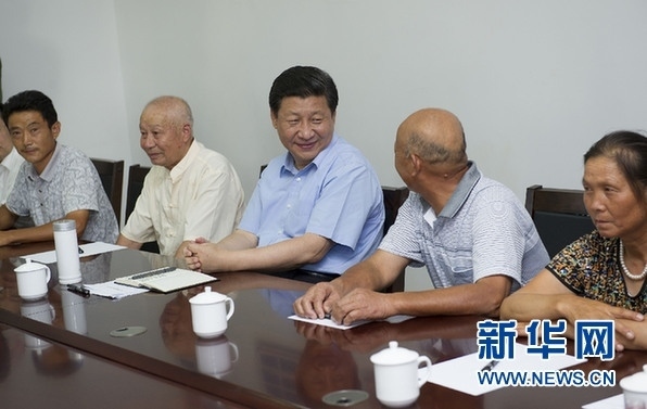 ▲2013年7月21日至23日,中共中央總書記、國家主席、中央軍委主席習近平在湖北調研全面深化改革問題和當前經(jīng)濟運行情況。 22日下午,習近平來到鄂州市長港鎮(zhèn)峒山村,了解城鄉(xiāng)一體化建設情況,同部分村民座談。