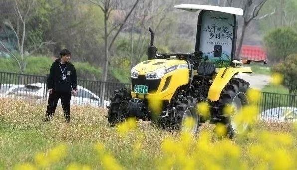 ▲位于光谷北斗大廈的武漢依迅北斗時空技術股份有限公司園區(qū)內,安裝了北斗高精度農(nóng)機自動駕駛終端的拖拉機正在進行測試