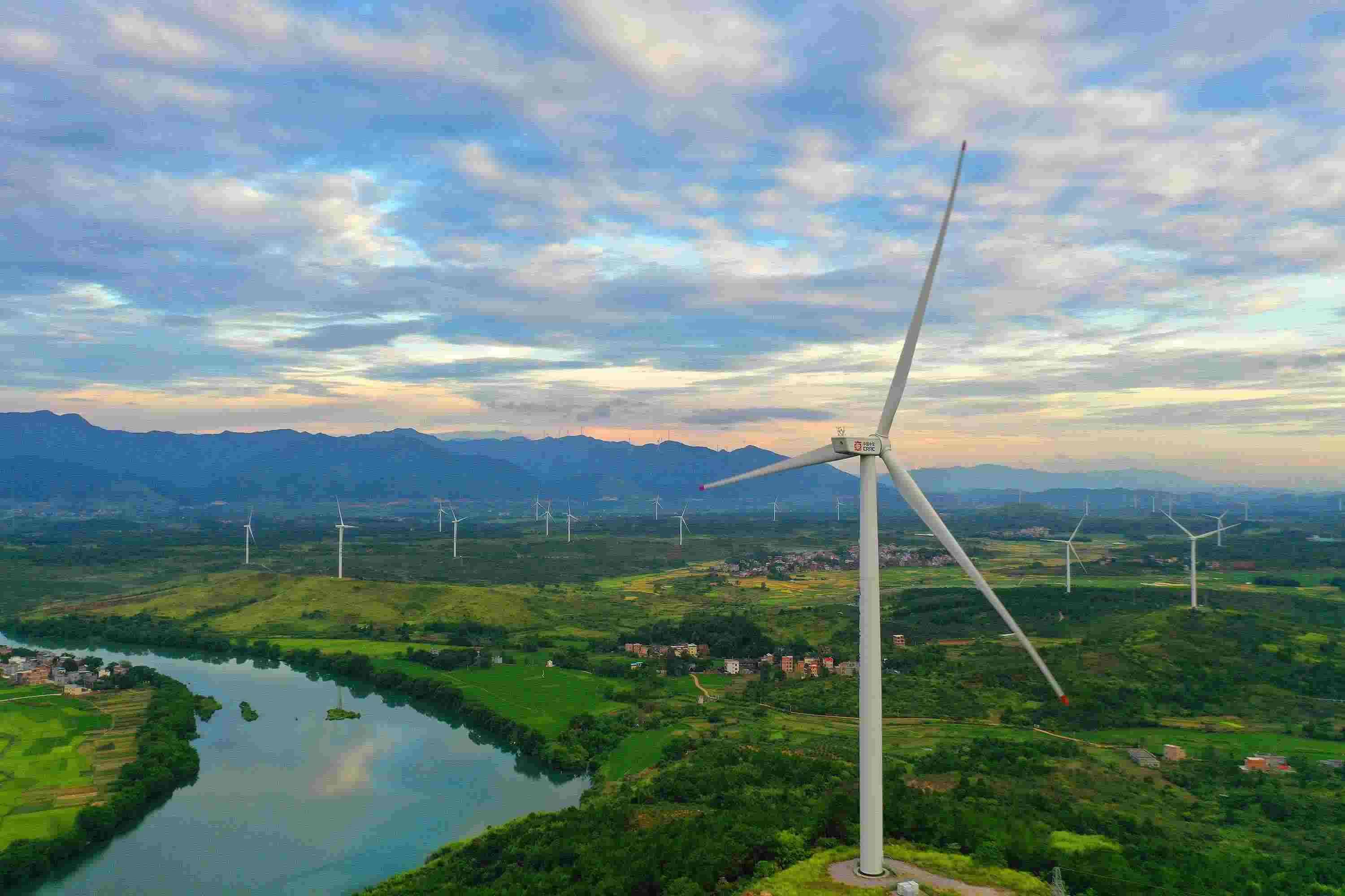 △ 湖南省永州市的風(fēng)力發(fā)電風(fēng)車(chē)與藍(lán)天、綠水、田野交相輝映,構(gòu)成一幅美麗的生態(tài)畫(huà)卷。