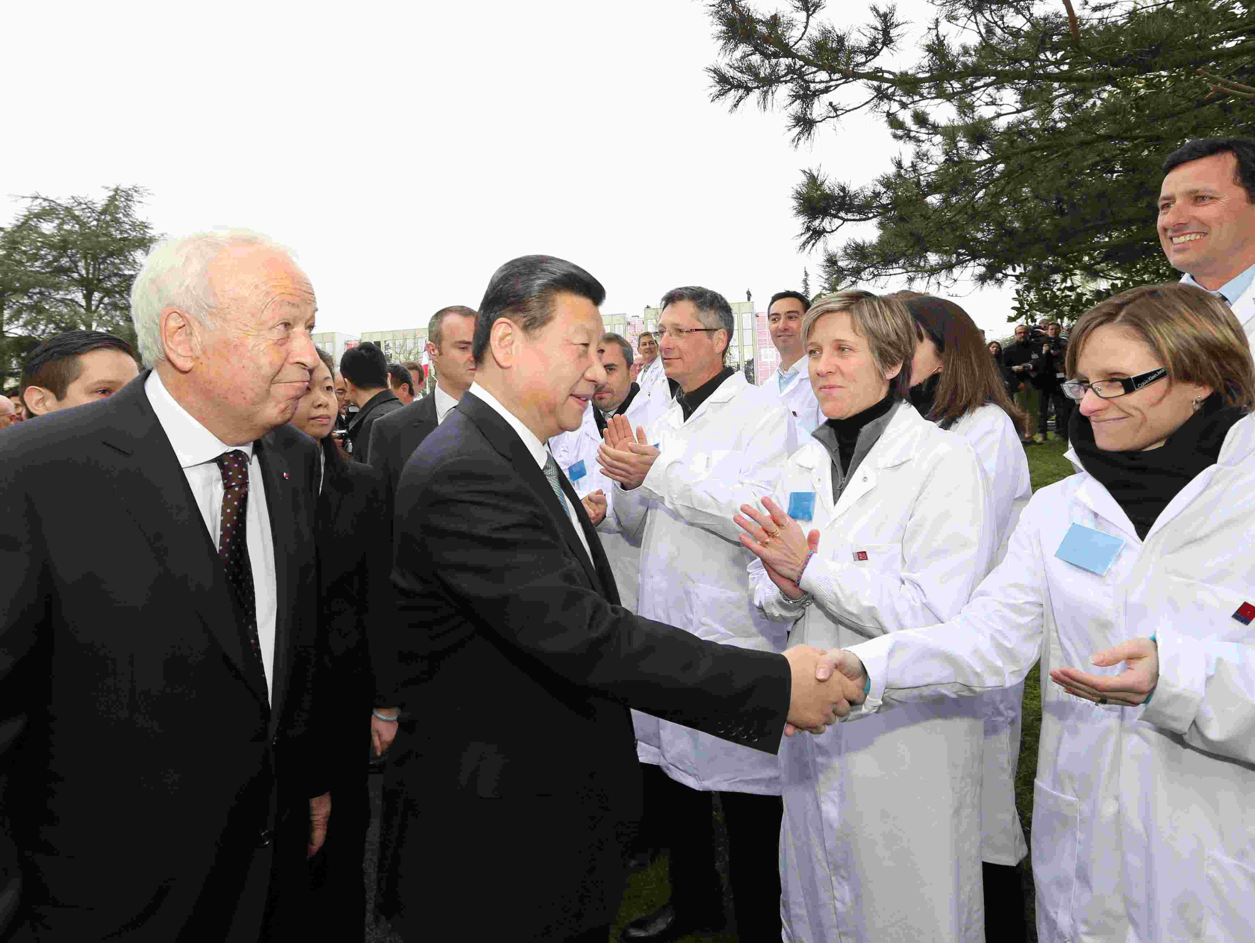 △2014年3月26日,習近平主席在法國里昂參觀梅里埃生物科研中心,與科研中心員工握手。