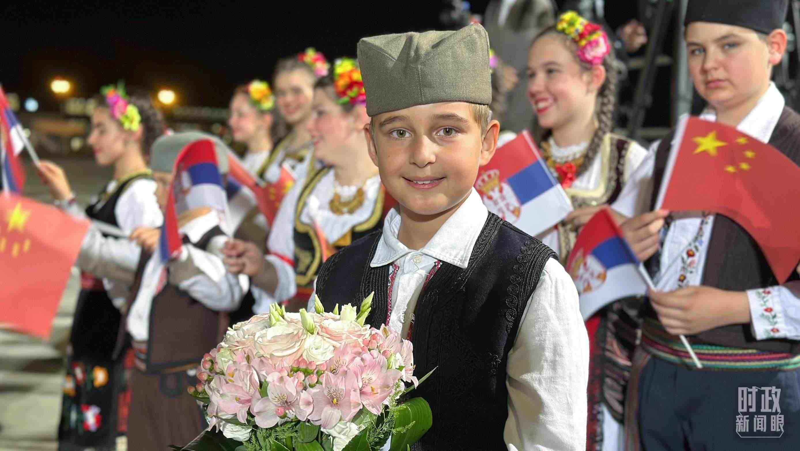 △機(jī)場(chǎng)迎接習(xí)主席的塞爾維亞少年。(總臺(tái)央視記者范一鳴拍攝)