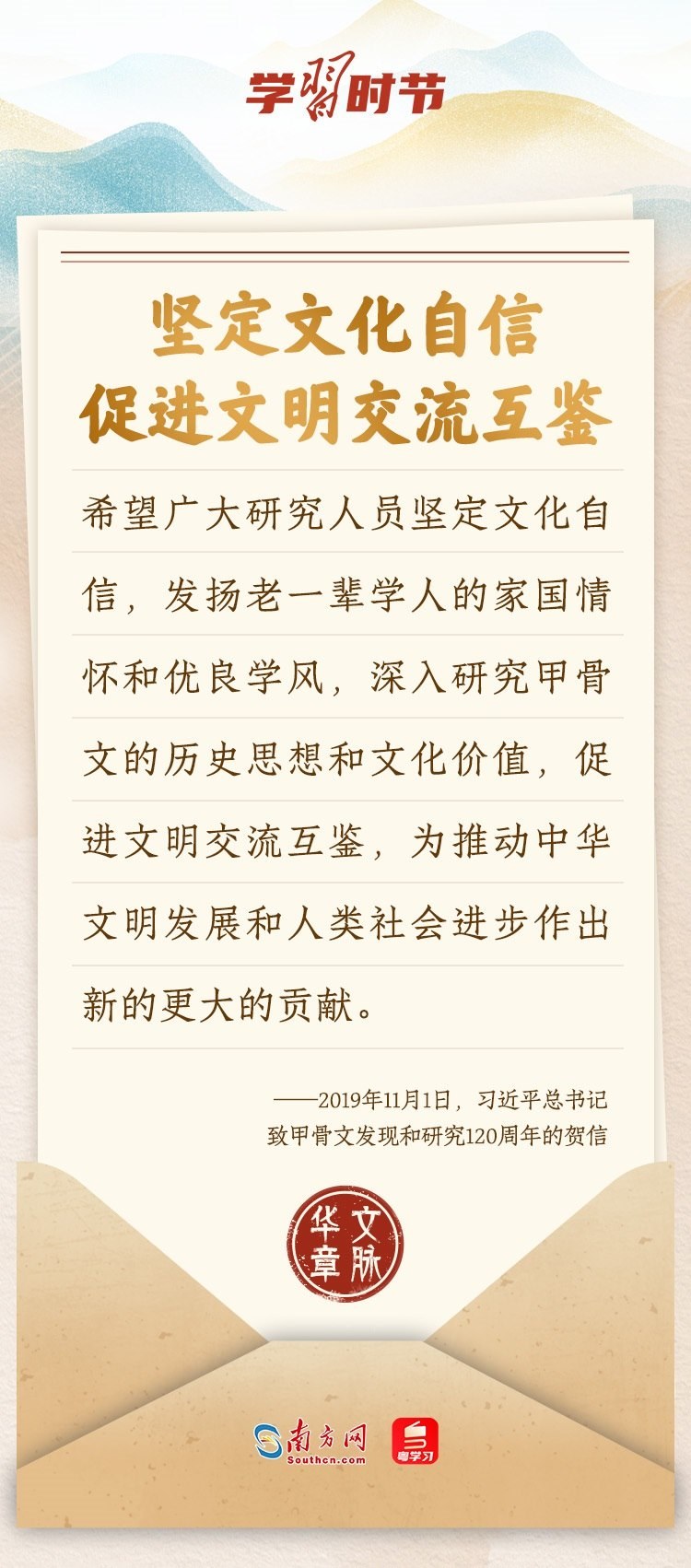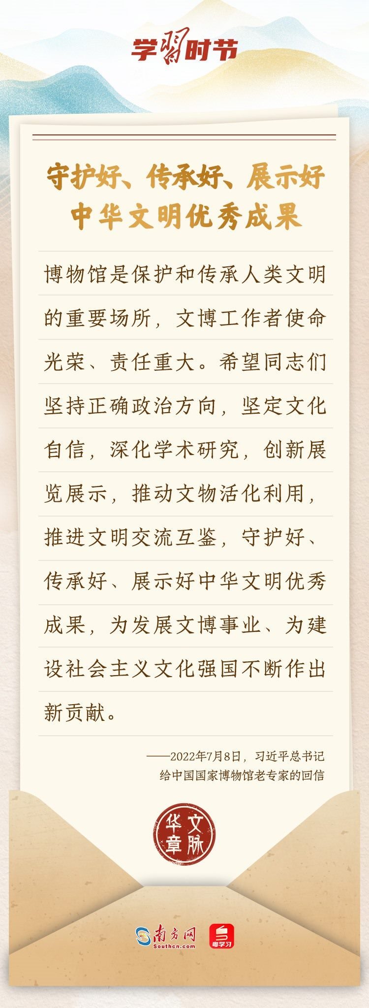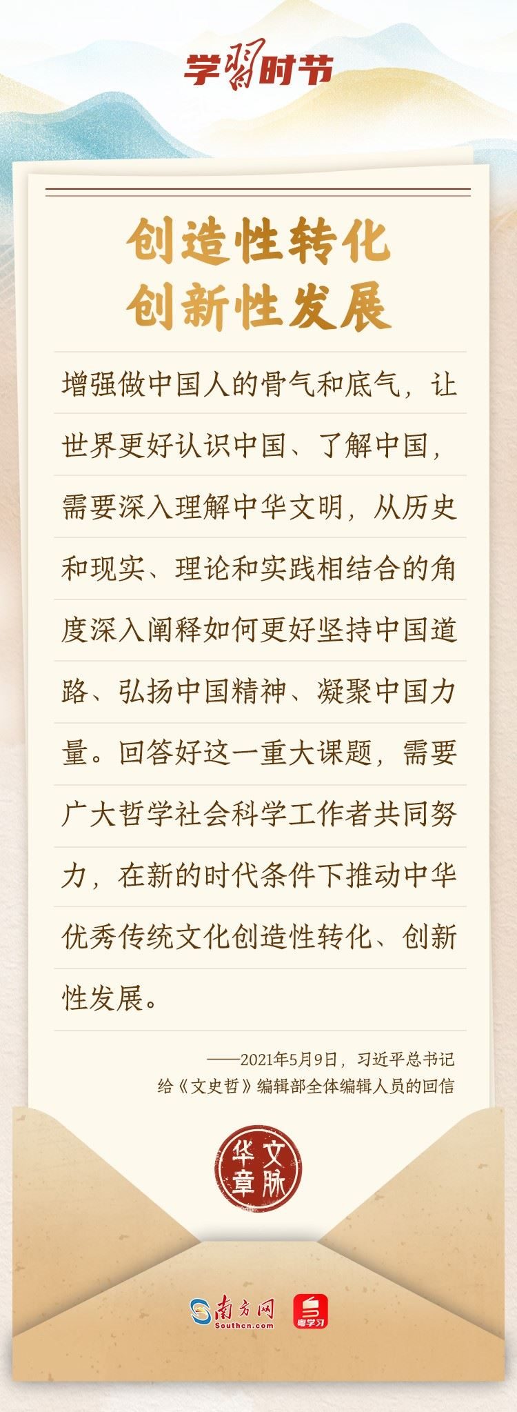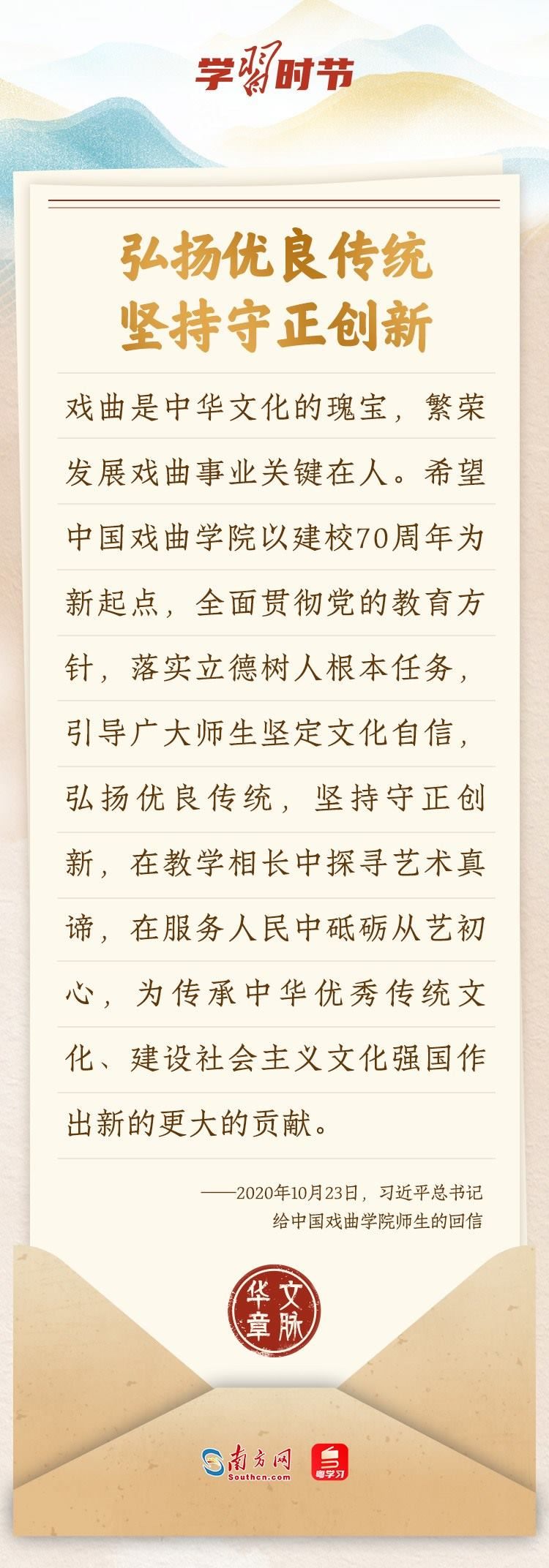 “中華民族在幾千年歷史中創(chuàng)造和延續(xù)的中華優(yōu)秀傳統(tǒng)文化,是中華民族的根和魂。”習(xí)近平總書記多次通過發(fā)賀信、寫回信等方式,表達(dá)著對弘揚(yáng)中華優(yōu)秀傳統(tǒng)文化的殷切希望,飽含深情、字字暖心、催人奮進(jìn)。讓我們一起“讀”信。