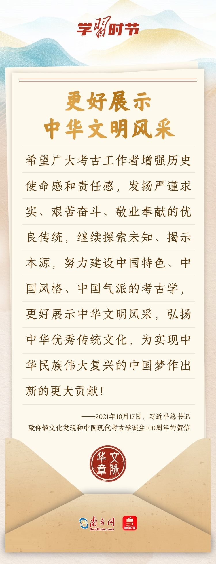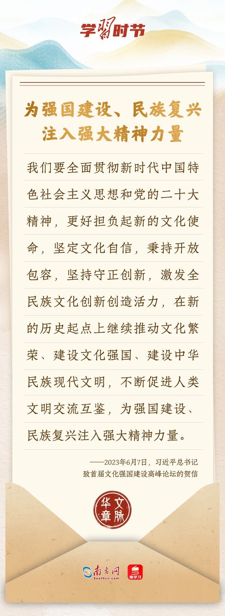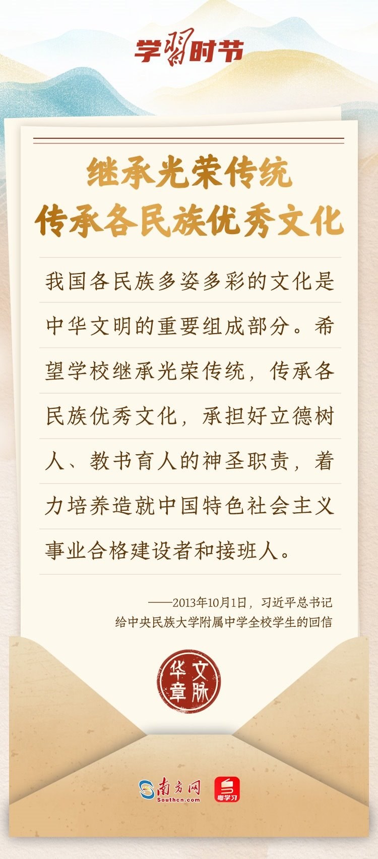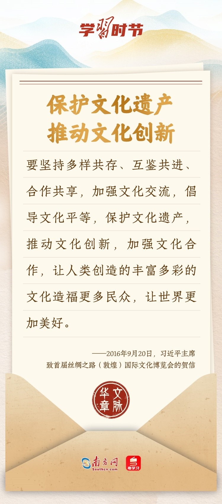 “中華民族在幾千年歷史中創(chuàng)造和延續(xù)的中華優(yōu)秀傳統(tǒng)文化,是中華民族的根和魂。”習(xí)近平總書記多次通過發(fā)賀信、寫回信等方式,表達(dá)著對弘揚(yáng)中華優(yōu)秀傳統(tǒng)文化的殷切希望,飽含深情、字字暖心、催人奮進(jìn)。讓我們一起“讀”信。