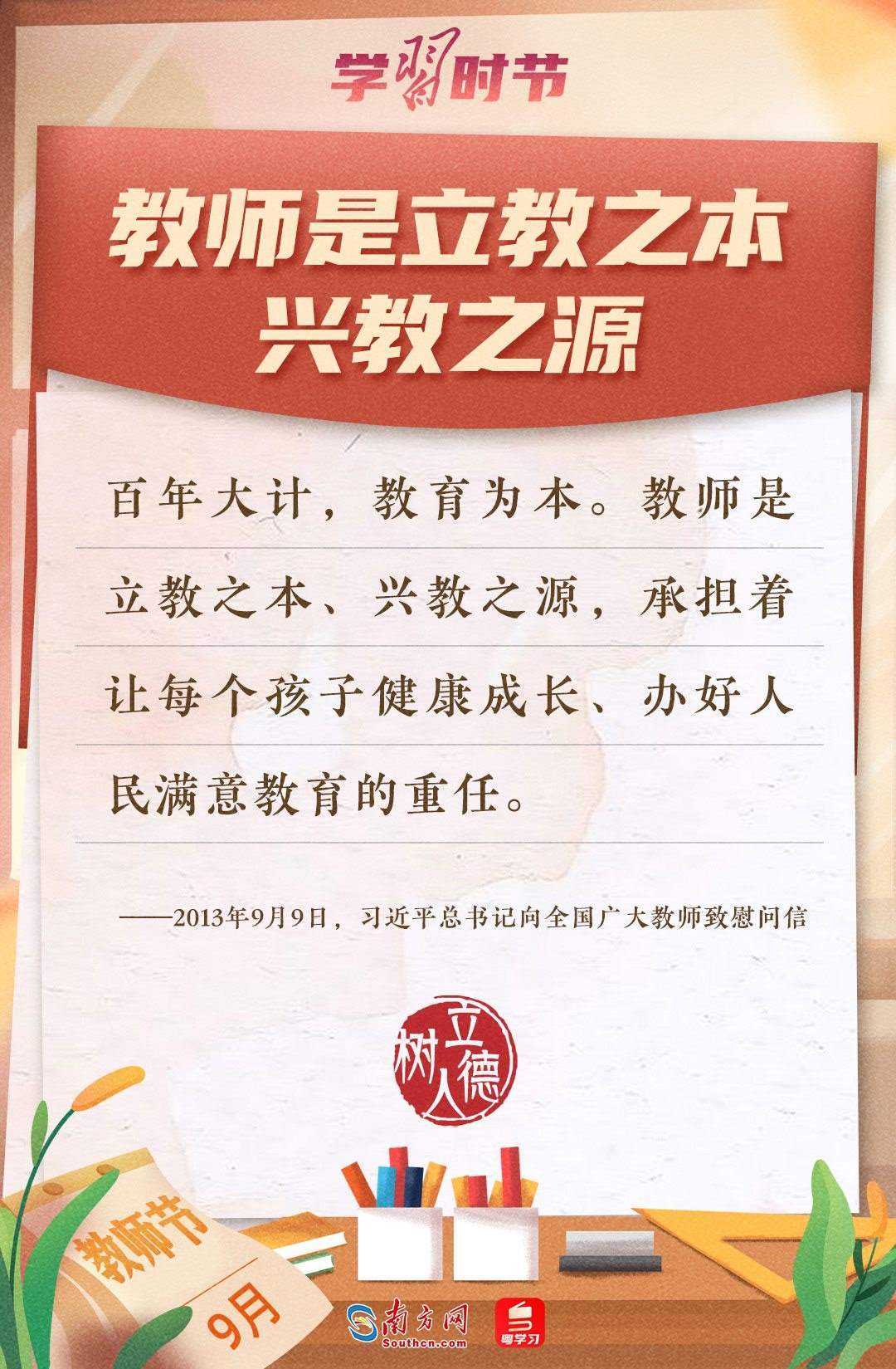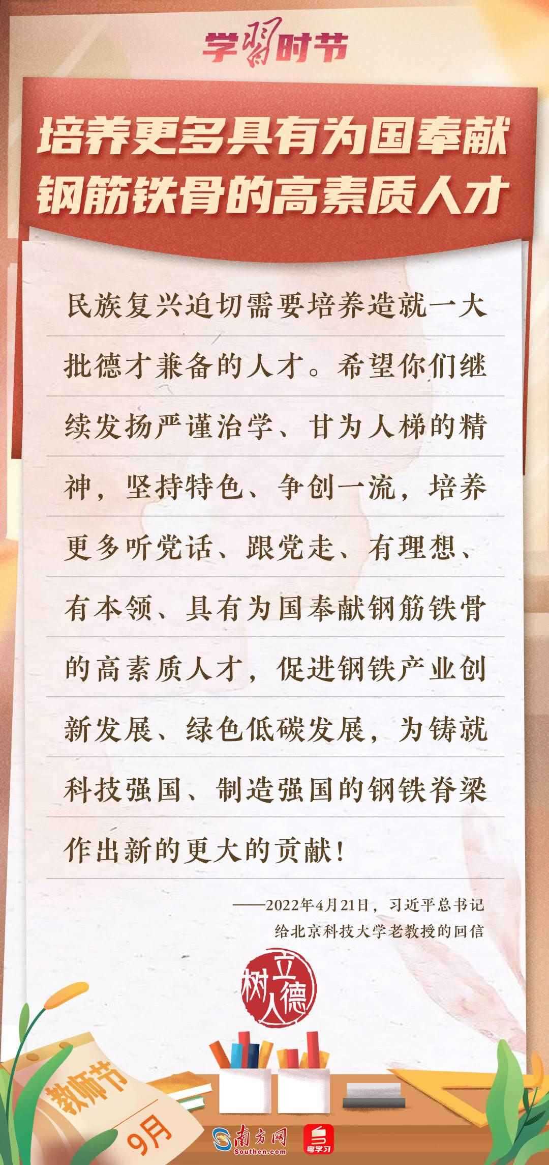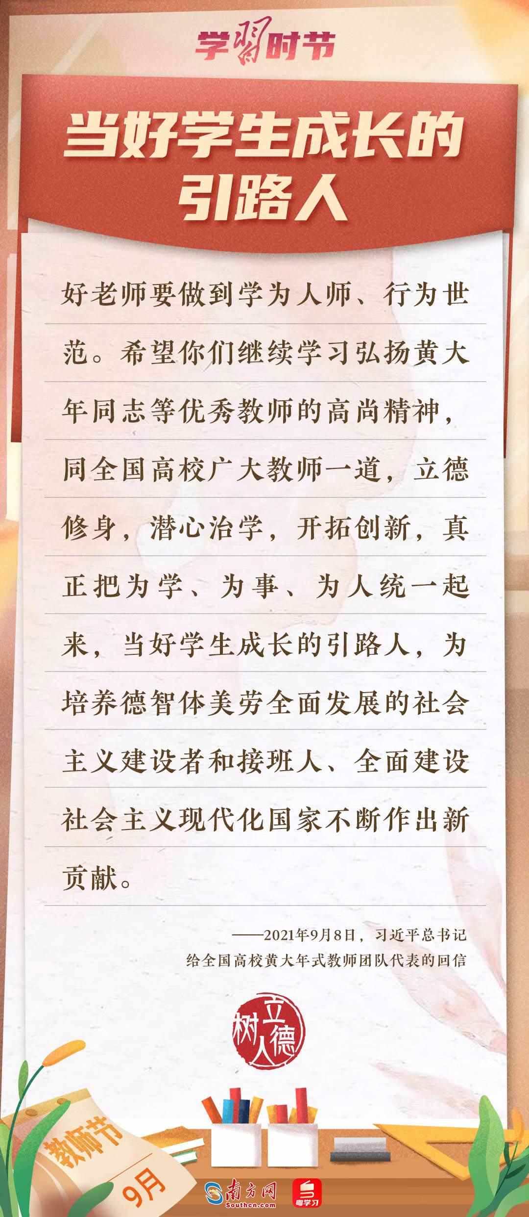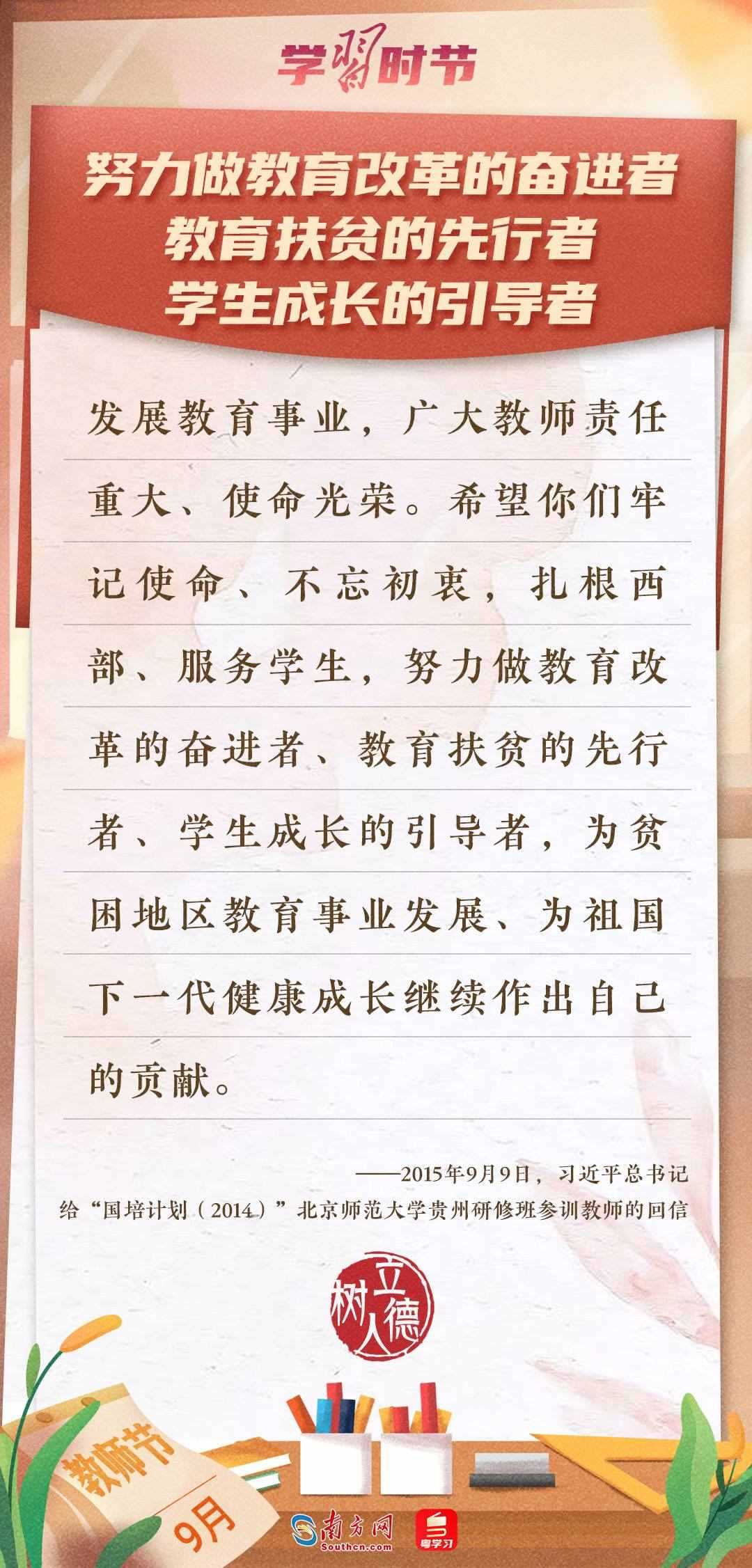 “百年大計,教育為本。教育大計,教師為本?!秉h的十八大以來,習(xí)近平總書記多次以書信形式向教師群體和教育工作者表達囑托與期望,諄諄話語,催人奮進。在第四十個教師節(jié)到來之際,讓我們一起重溫總書記的諄諄寄語!