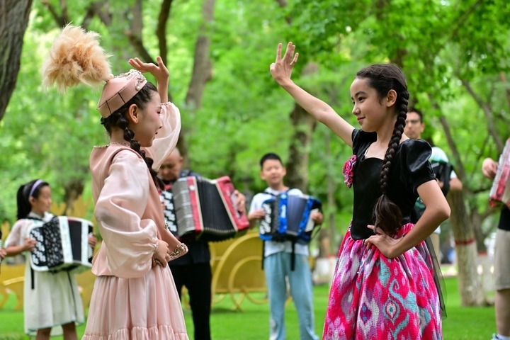 在新疆塔城市文化廣場,練習手風琴的孩子隨著琴聲翩翩起舞(2024年7月24日攝)。新華社記者 丁磊 攝