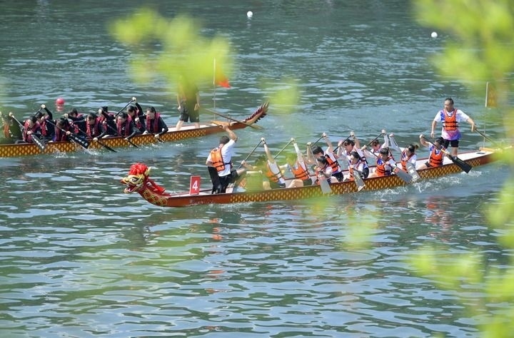 2024年8月10日,湖北省恩施土家族苗族自治州宣恩縣城區(qū)貢水河上,選手在第十二屆全國少數(shù)民族傳統(tǒng)體育運動會“同心暢享”系列活動——全國龍舟邀請賽200米直道賽預賽中。新華社發(fā)(宋文攝)