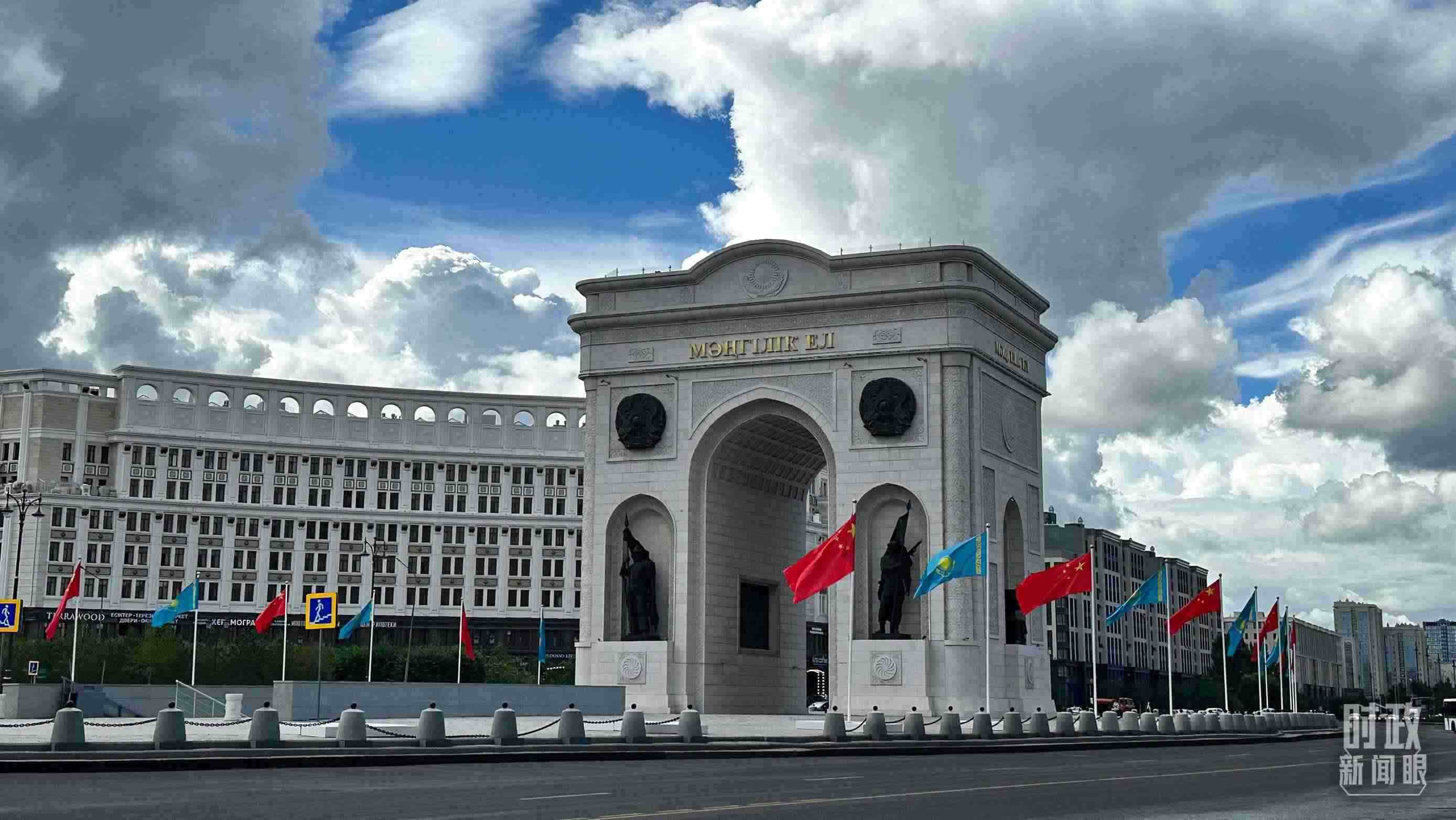 △阿斯塔納地標建筑“凱旋門”兩側,中哈兩國國旗迎風招展。(總臺央視記者關舟拍攝)