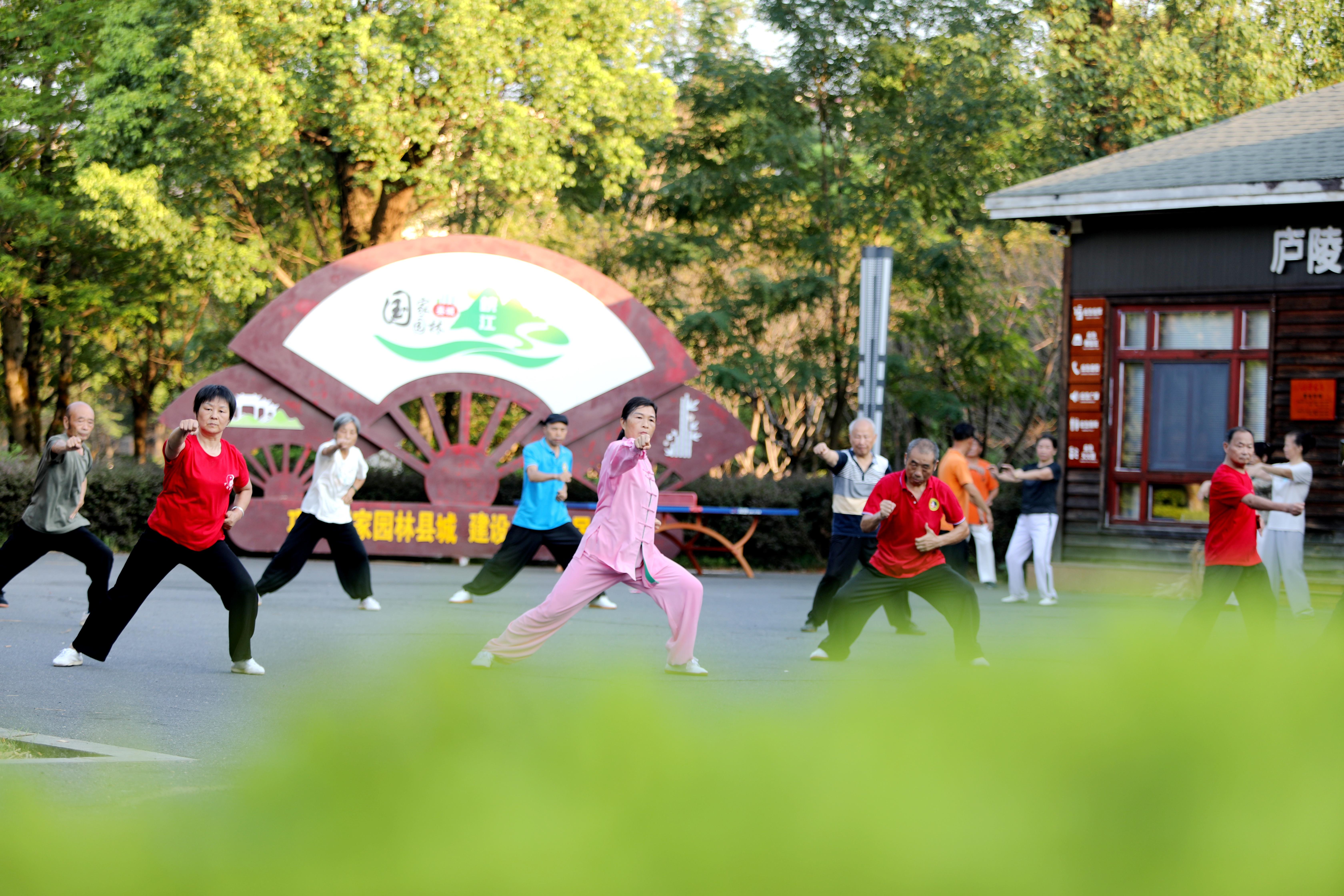 △2024年7月24日,江西省吉安市峽江縣水邊鎮(zhèn)一濕地公園休閑廣場(chǎng),老年人在打太極。